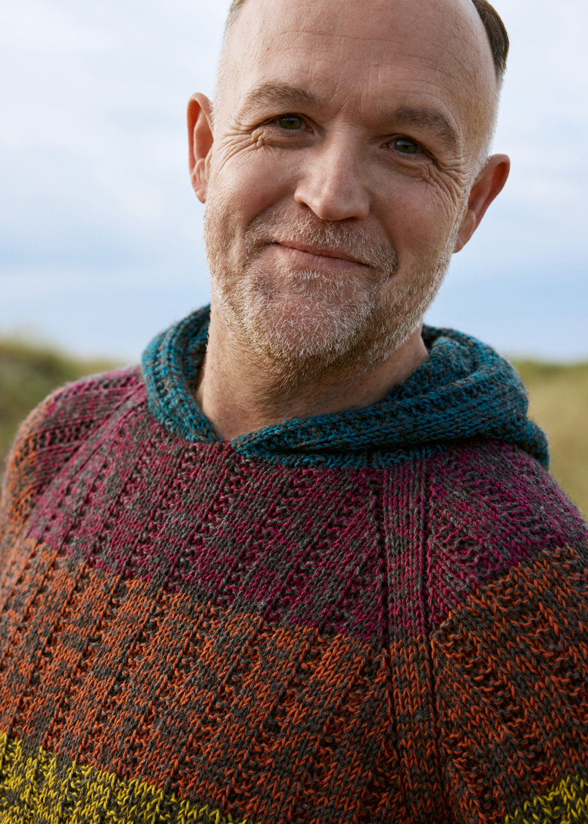 Lana Grossa Ecopuno (72% хлопок, 17% меринос 11% беби альпака, длина нити 215 m/50 g), 300 (350 – 400 – 400) г темно серый (цв 15) и Lana Grossa Merino Superiore (100% шерсть (меринос), длина нити 180 m/50 g), 100 г темно сине-зеленый (цв 19), 50 (100 – 100 – 100) г бордо (цв 27), 50 (100 – 100 – 100) г терракотовый (цв 11), 50 (100 – 100 – 100) г жёлтый (цв 10), 50 (100 – 10 – 100) г зеленый лист (цв 14), 50 (100 – 100 – 100) г тёмно-зелёный (цв 17), 50 (100 – 100 - 100) г тёмно-синий (цв 20) и 50 (100 – 100 – 100) г джинс- синий (цв 22); по 1 кр. сп. № 4, 40 и 80 см, по 1 кр. сп. № 5, 40, 60 и 80 см, 8 маркировки