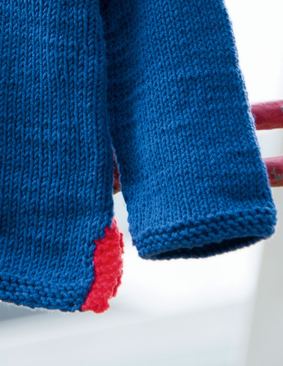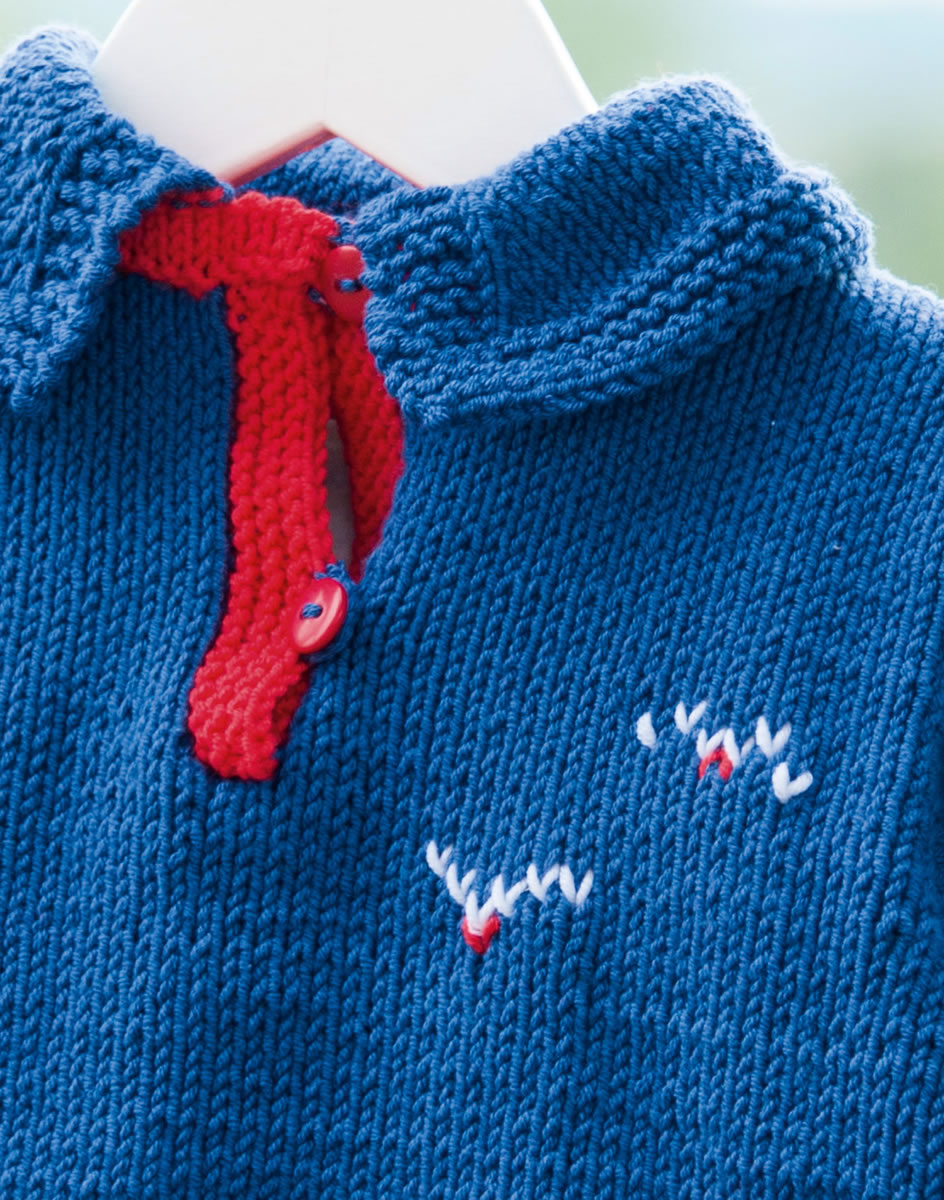 150 г темно-синей (цвет 114), 50 г ярко-красной (цвет 78) и остаток белой (цвет 1) пряжи Elastico фирмы Lana Grossa (96% хлопка, 4% полиэстера, 160 м/50 г); прямые спицы № 3,5, круговые спицы № 3,5 длиной 40 см, вязальный крючок № 3; 2 пуговицы.