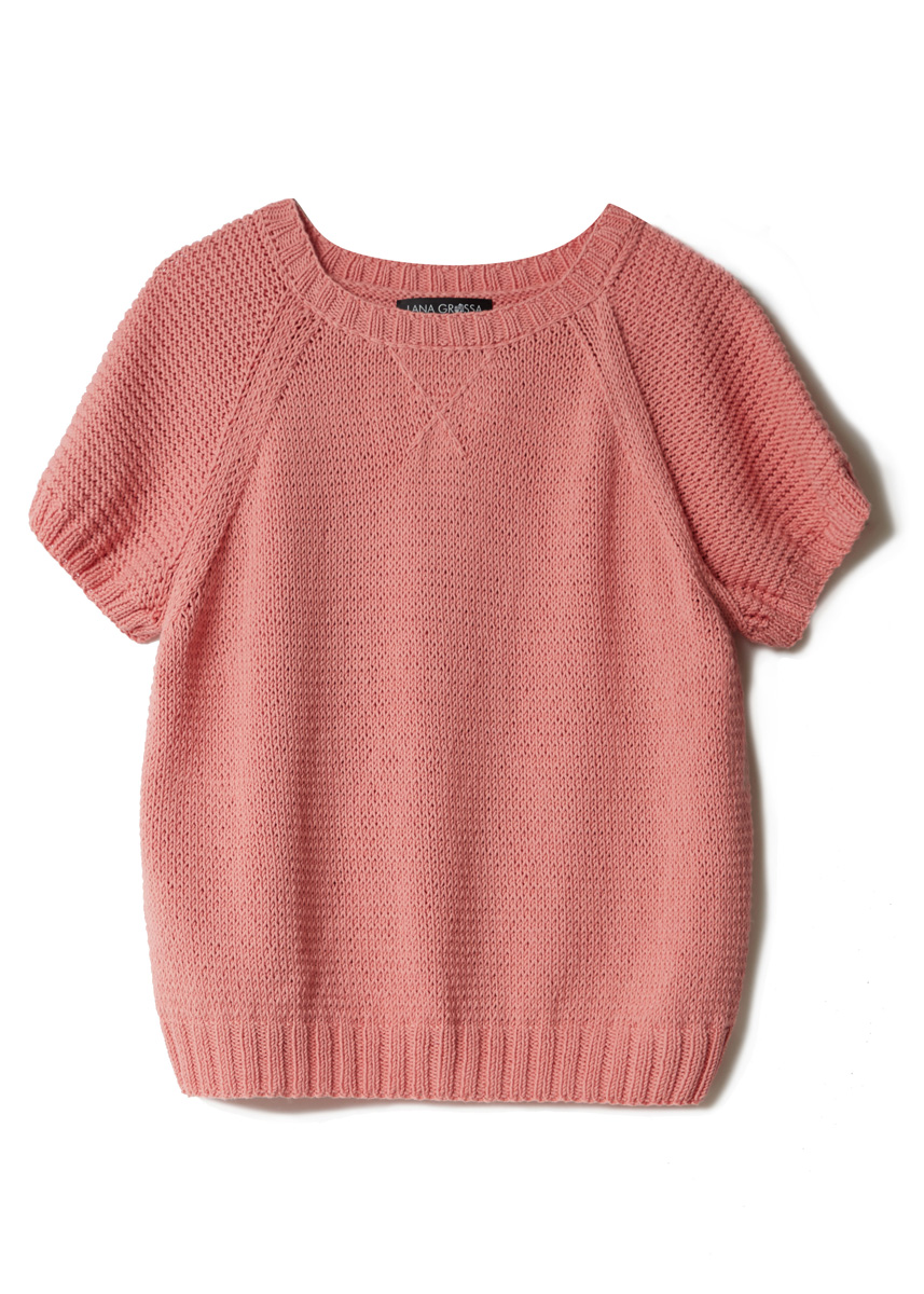 250 (300–300) г желто-розо- вой (цв. 132) пряжи Elastico (96% хлопка, 4% по- лиэстера (elite), 160 м/50 г) фирмы Lana Grossa; прямые спицы № 3,5, № 4 и № 5,5, круговые спи- цы № 3,5 длиной 40 см и крючок № 3,5