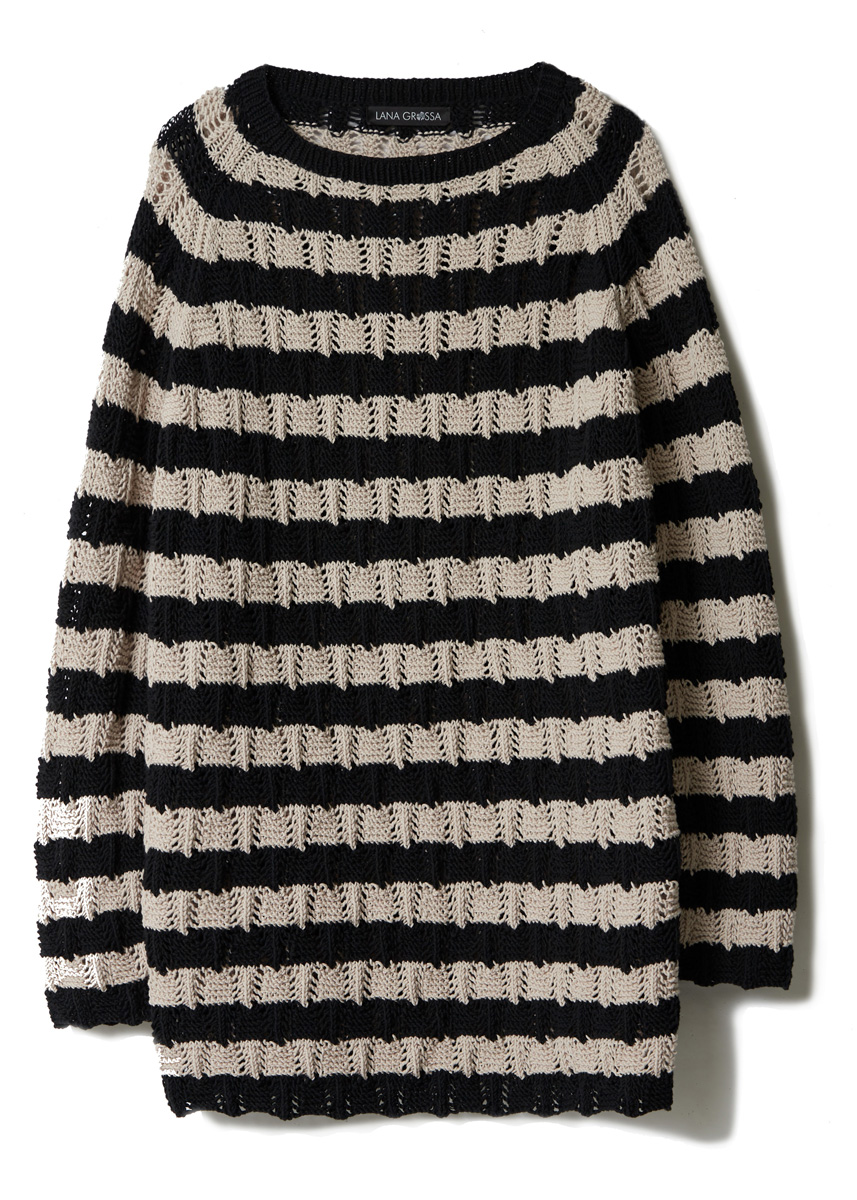 350 (400–450) г черной (цв. 24) и 300 (350–400) г бежевой (цв. 97) пряжи Elastico (96% хлоп- ка, 4% полиэстера (elite), 160 м/50 г) фирмы Lana Grossa; прямые спицы № 3,5 и круговые спицы № 3 длиной 40 см