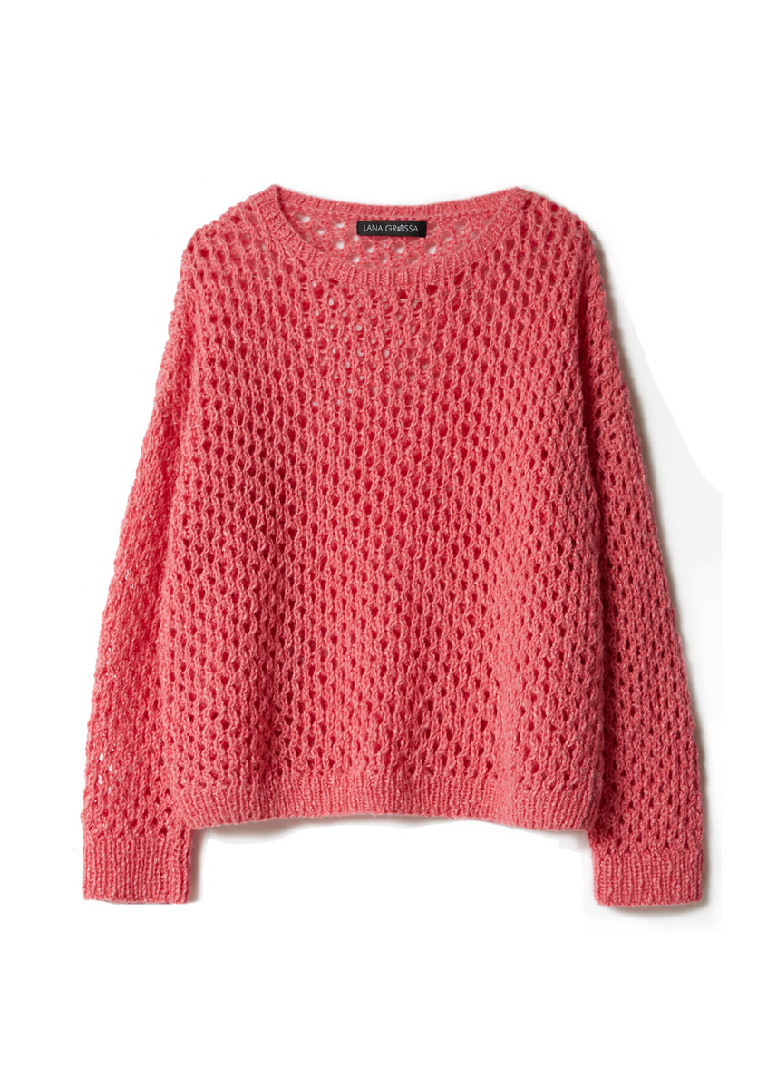 350 (400–450) г мали- новой (цв. 6) пряжи Fantasia (50% хлопка, 24% вискозы, 16% альпака бэби, 10% шер- сти мерино экстрафайн, 125 м/50 г) фирмы Lana Grossa; прямые спицы № 4,5 и № 5,5, круговые спицы № 4,5 длиной 50 см.