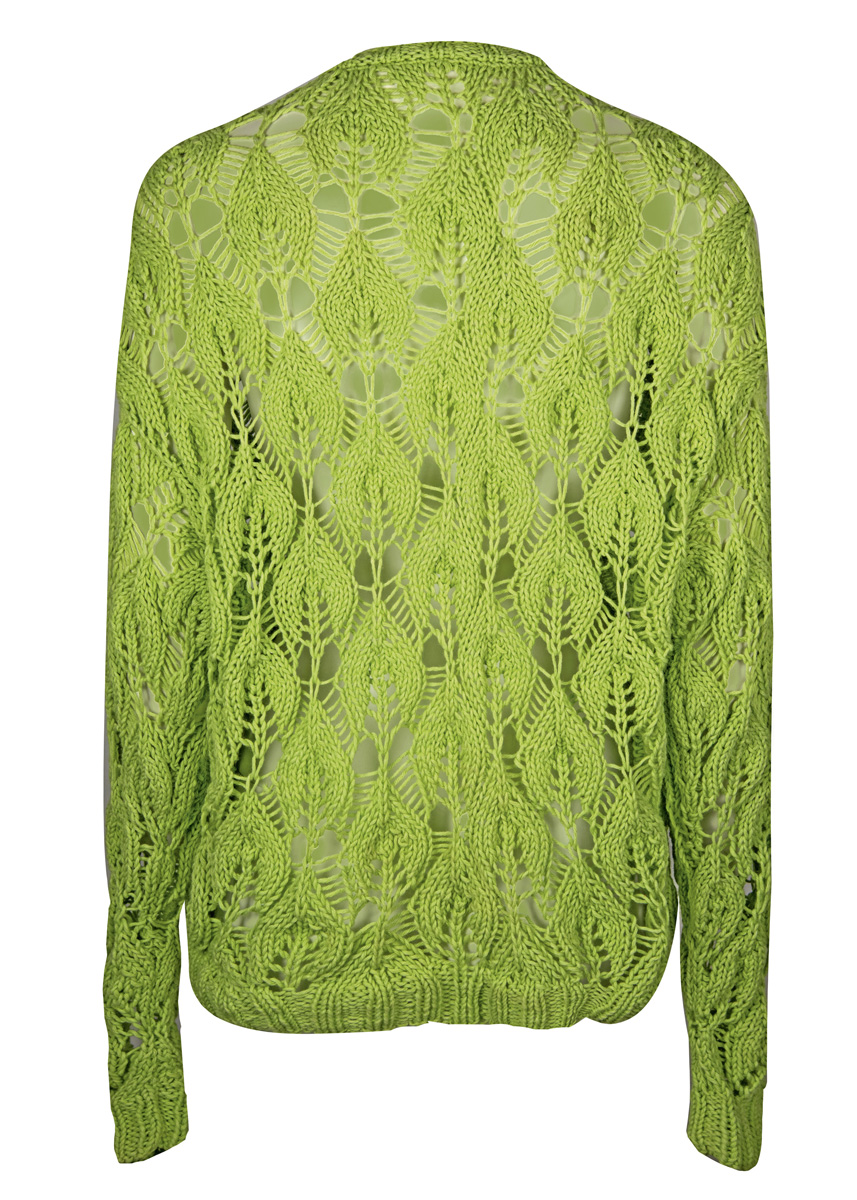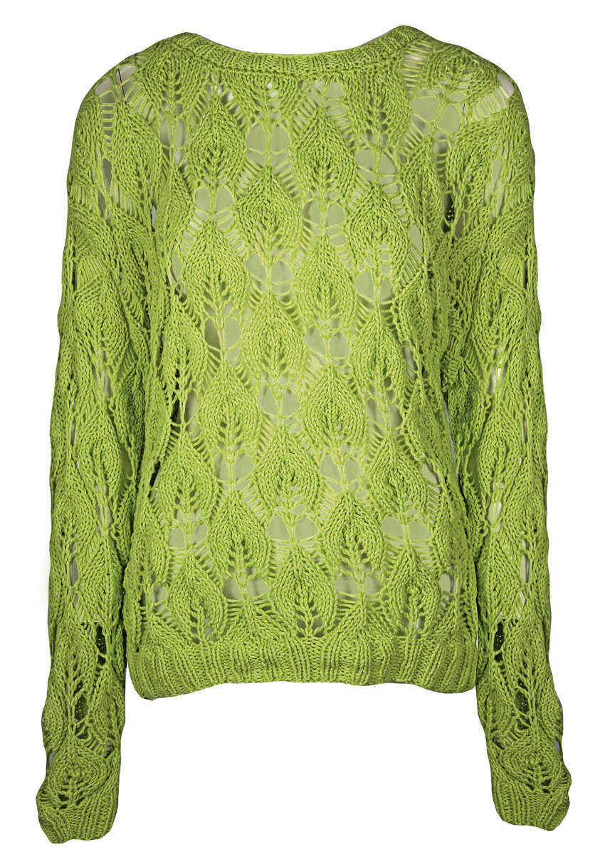 Lana Grossa-Qualität „Fourseason” (45 % биол. меринос, 40 % биол. хлопок, 15 % перераб. кашемир, длина нити = ок. 105 m/50 g): ок. 350 г желто - зеленый (цв. 23); сп. № 4 и 5, кр. сп. № 4, 50 см длиной, крючок № 4
