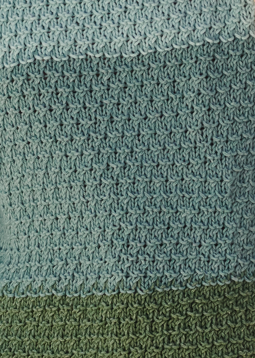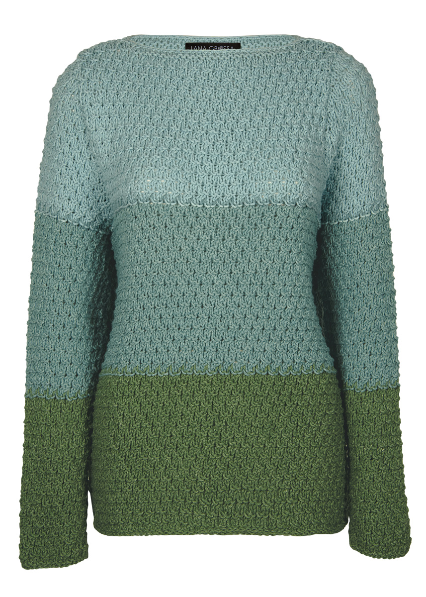 150 (200–200) г цвета мяты (цв. 4), 150 (200–200) г светло-петрольной (цв. 6) и 150 (200–200) г зеленой (цв. 7) пряжи Fourseason (45% био-шерсти (мериносовой шерсти extrafine), 40% био-хлопка, 15% рециклированного кашемира, 105 м/50 г) фирмы Lana Grossa; прямые спицы № 6, крючок № 4.
