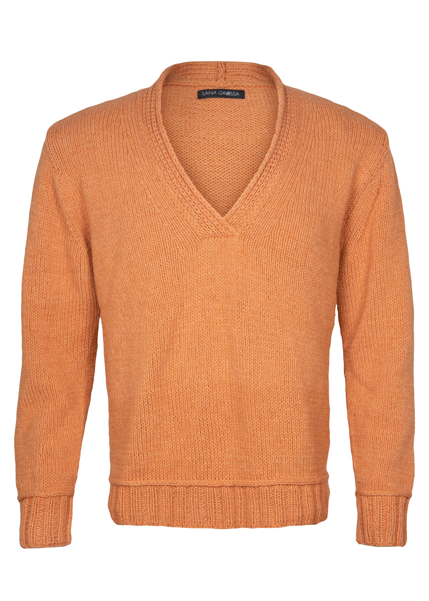 500 (550–600) г коричнево-оранжевой (цв. 21) пряжи Fourseason (45% био-шерсти (мериносовой шерсти extrafine), 40% био-хлопка, 15% рециклированного кашемира, 105 м/50 г) фирмы Lana Grossa; прямые спицы № 4,5 и № 5