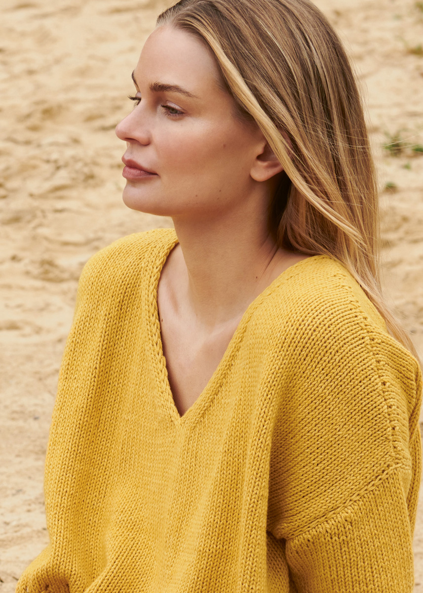 Lana Grossa-Qualität „Fourseason” (45 % орг. шерсть (меринос), 40 % биохлопок, 15 % перераб. кашемир, длина нити = ca. 105 m/50 g): ок. 350 (400) г жёлтый (цв. 8); сп. № 5
