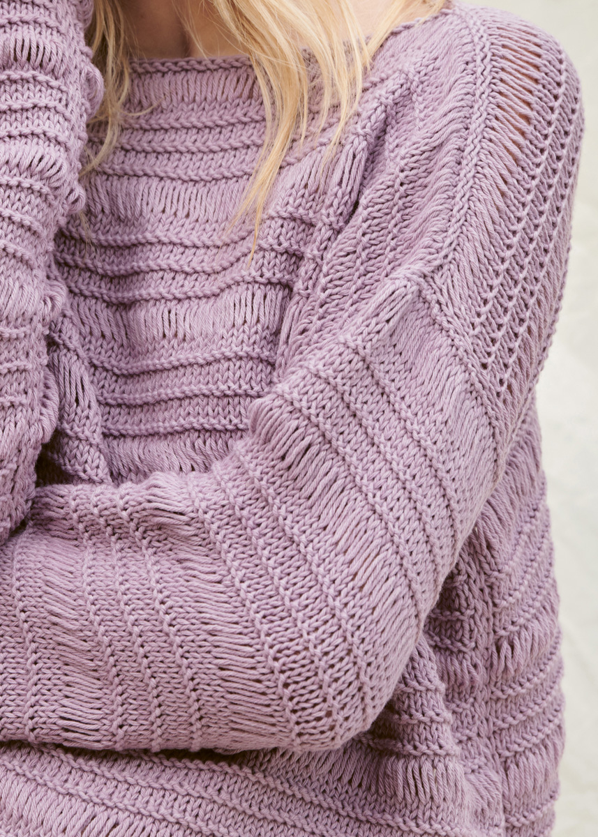 Lana Grossa-Qualität „Fourseason” (45 % орг. шерсть (меринос), 40 % биохлопок, 15 % перераб. кашемир, длина нити = ca. 105 m/50 g): ок. 400 г серо- фиолетовый (цв. 17); сп. № 5,5