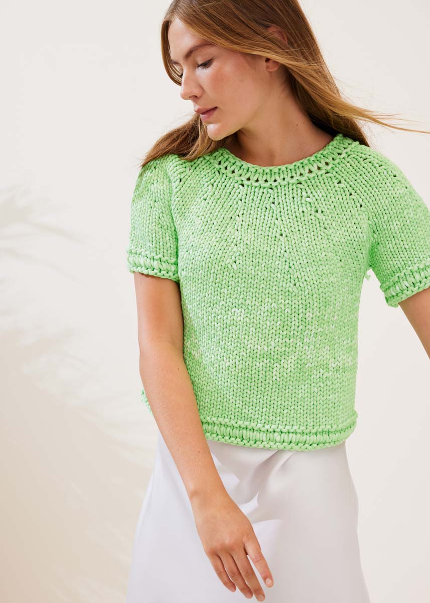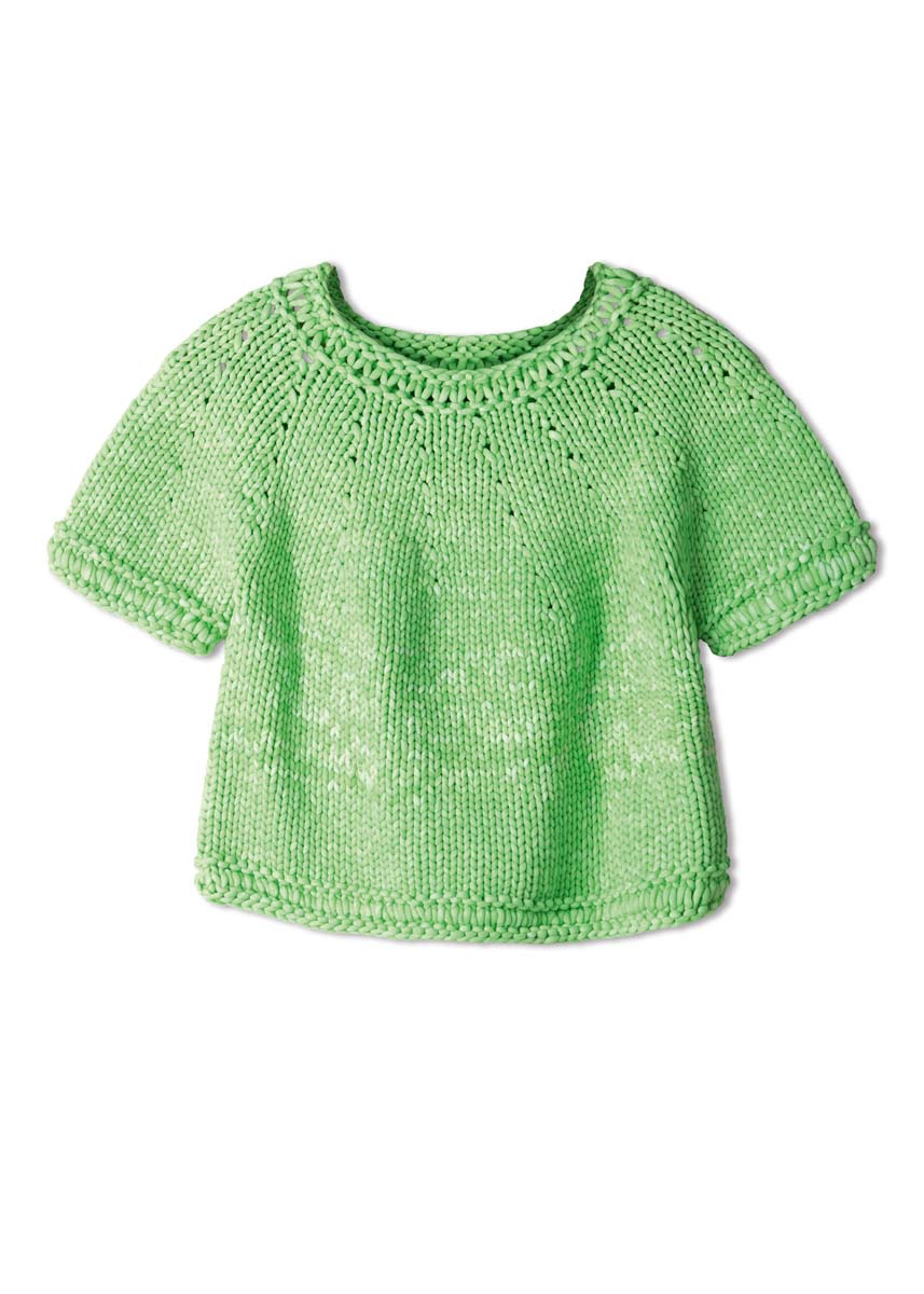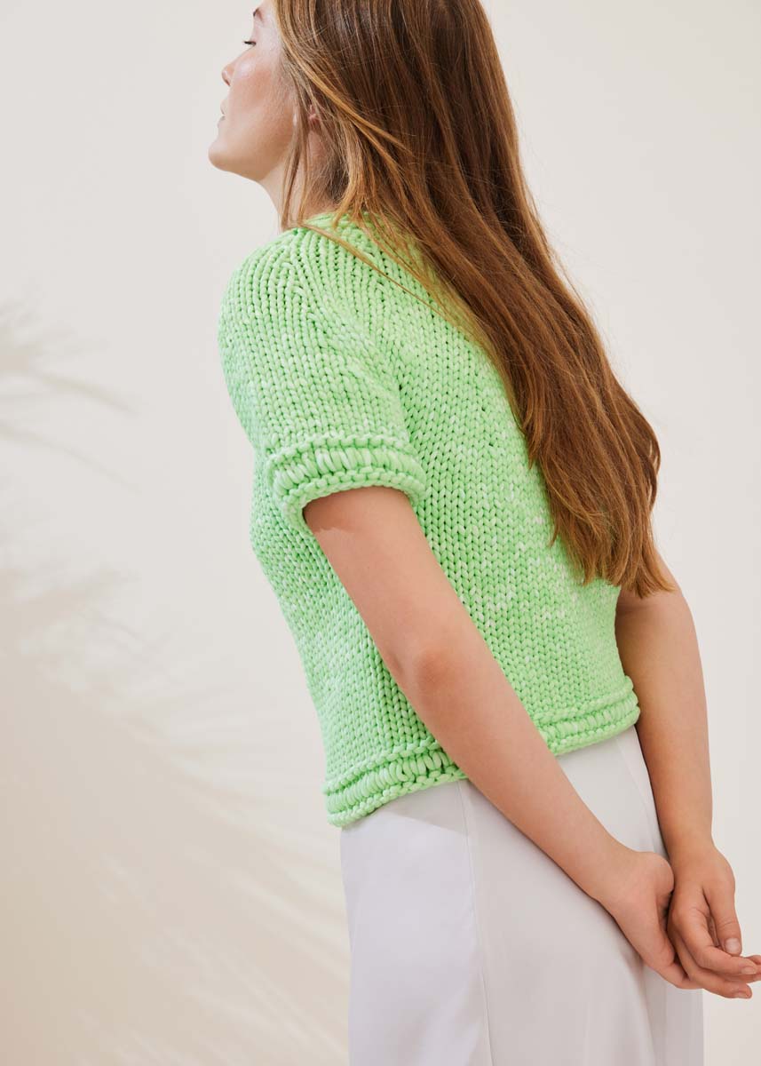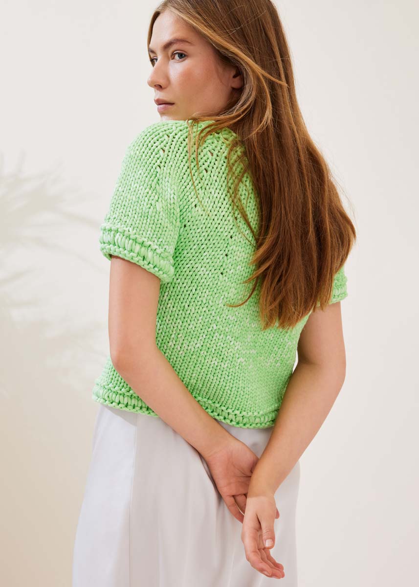 Lana Grossa-Qualität „Gelato Vintage“ (52 % хлопок, 48 % полиамид (перераб.), длина нити = ca 80 m/100 g): ок 400 (500–600) г зелёная весна/белый (цв 107); кр. сп. № 12 и 15.