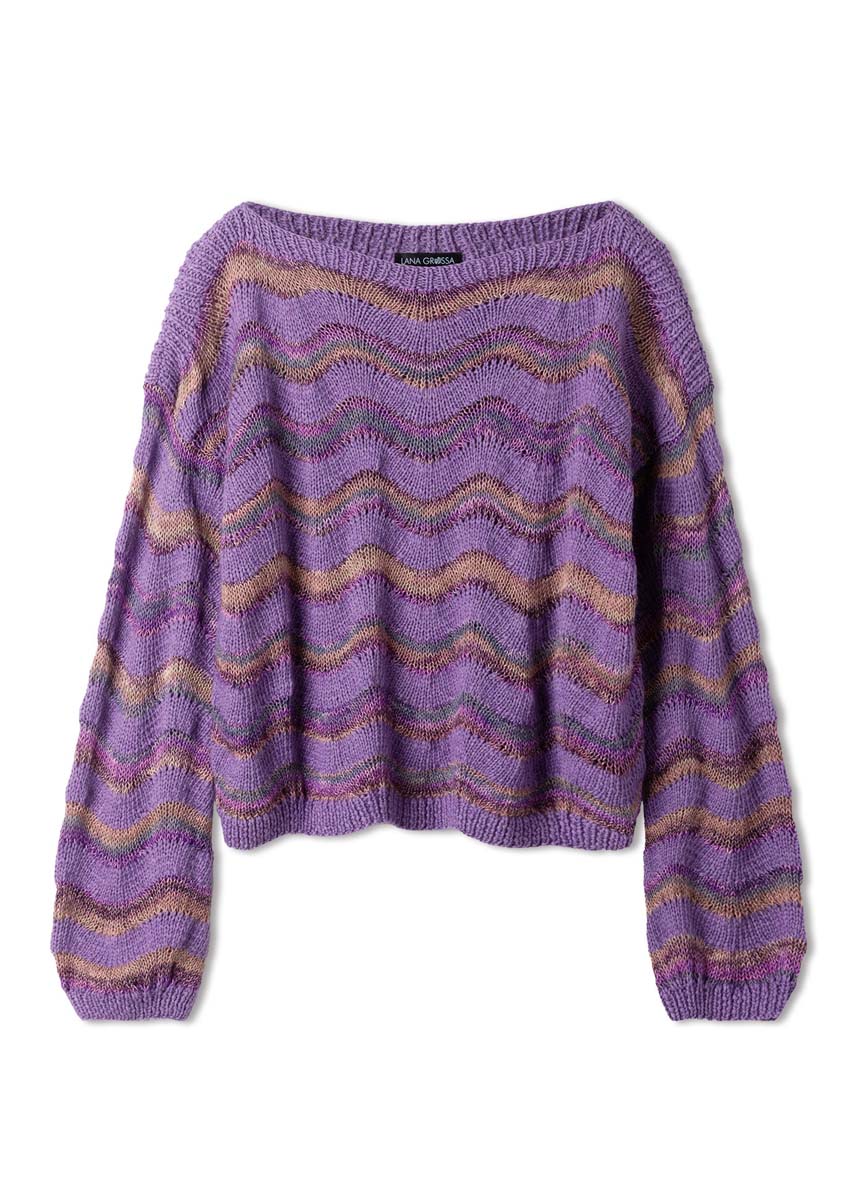 Lana Grossa-Qualität „Gianna“ (80 % хлопок (био), 15 % шерсть (меринос), 5 % кашемир, длина нити = ca 180 m/50 g): ок 200 (200 - 300) г фиолетовый/бургунд/ серый/сирень/серо-синий/легко коричневый (цв 3) и Lana Grossa-Qualität „Summer Softness“ (80 % хлопок (био), 20 % шерсть (меринос суперфейн), длина нити = ca 130 m/50 g): ca 250 (300 - 350) г лиловый (цв 9); сп. № 4 и 4,5.