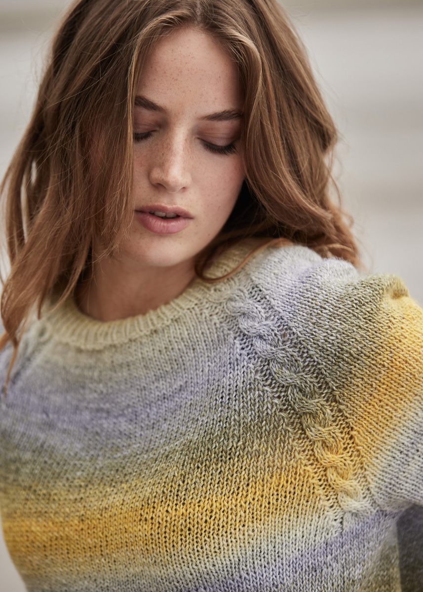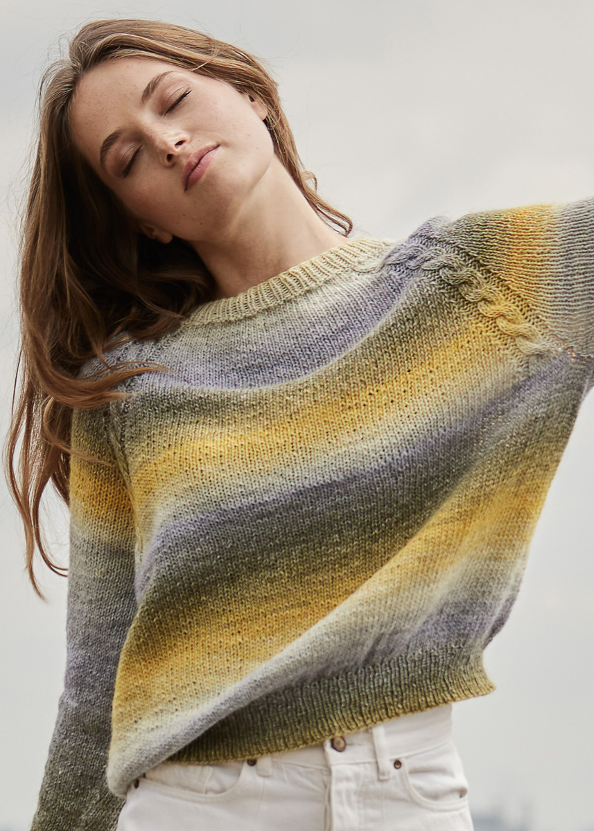 Lana Grossa-Qualität „Gomitolo Versione“ (60 % шерсть, 40 % полиакрил, длина нити = ок 700 m/200 g): ок 400 (400–400) г шифер-серый/пепельно-серый/светло- серый/ванильный/жёлтый (цв 430) или петроль синий/ серо-коричневый/серо-коричневый/оранжевый/синий (цв 428); кр. сп. № 3,5 и 4, чул. сп. № 3,5 и 4, вспом. сп