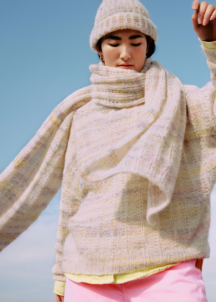 350 (400–450) г белой суровой/сиреневой/розовой (цв. 9) пряжи Lala Berlin Hazy (40% альпака бэби, 25% шерсти мерино экстрафайн, 25% полиами- да, 6% лиоцелла, 4% хлопка, 250 м/50 г)фирмы Lana Grossa; прямые спицы № 7 и № 8, круговые спицы № 7.