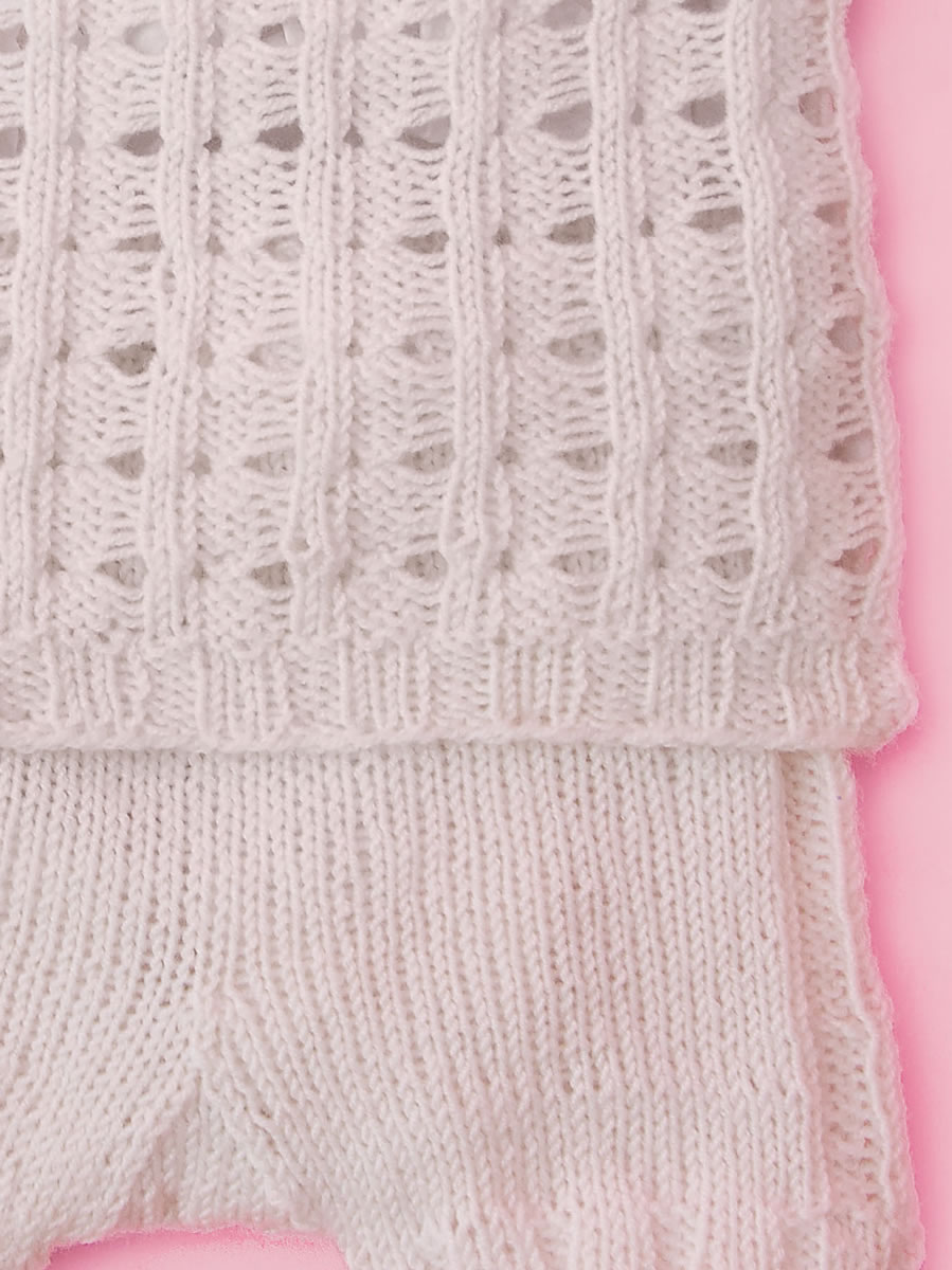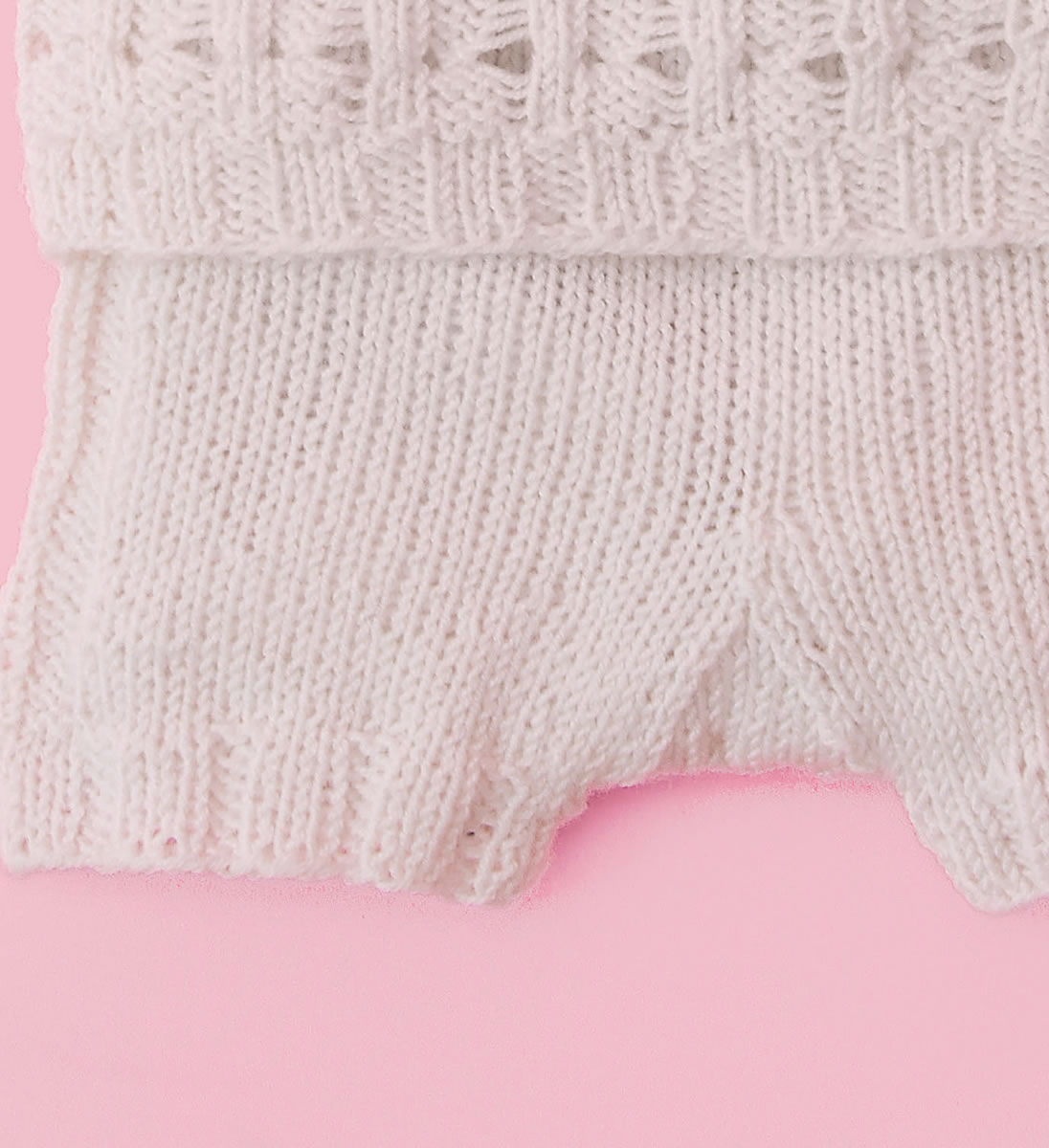 100 г белой (цвет 207) пряжи Cool Wool Baby фирмы Lana Grossa (100 % шерсти, 220 м/50 г); круговые спицы № 3 длиной 40 см, вязальный крючок № 2,5; 1 пуговица и резинка.