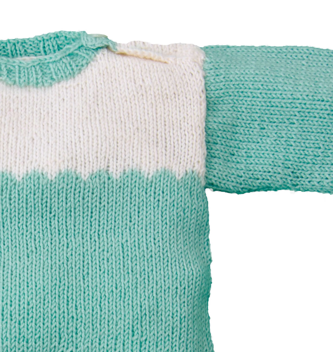 по 50 г белой (цвет 207) и светло-бирюзовой (цвет 230) пряжи Cool Wool Baby фирмы Lana Grossa (100 % шерсти, 220 м/50 г); круговые спицы № 3 длиной 40 см, вязальный крючок № 2,5; 2 пуговицы и резинка