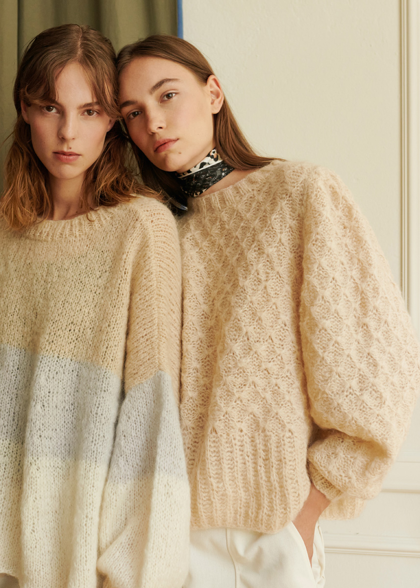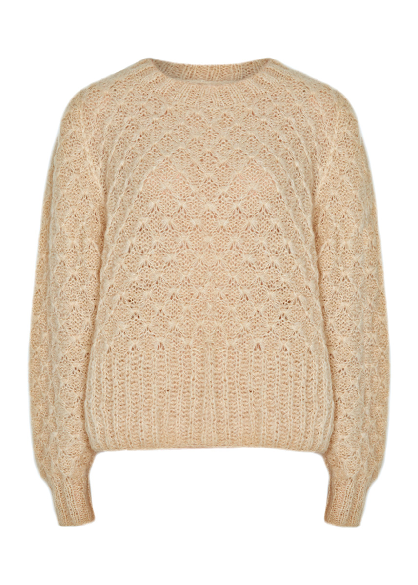 Lana Grossa-Qualität „Lala Berlin Brushy“ (42 % мохер (суперкид), 38 % шерсть (меринос), 20 % полиамид, длина нити 135 m/50 g): ок. 350 (400) г бежевый (цв. 7); сп. № 5,5 и 6, 1 кр. сп. № 5,5, 50 см длиной, 1 крючок № 5,5