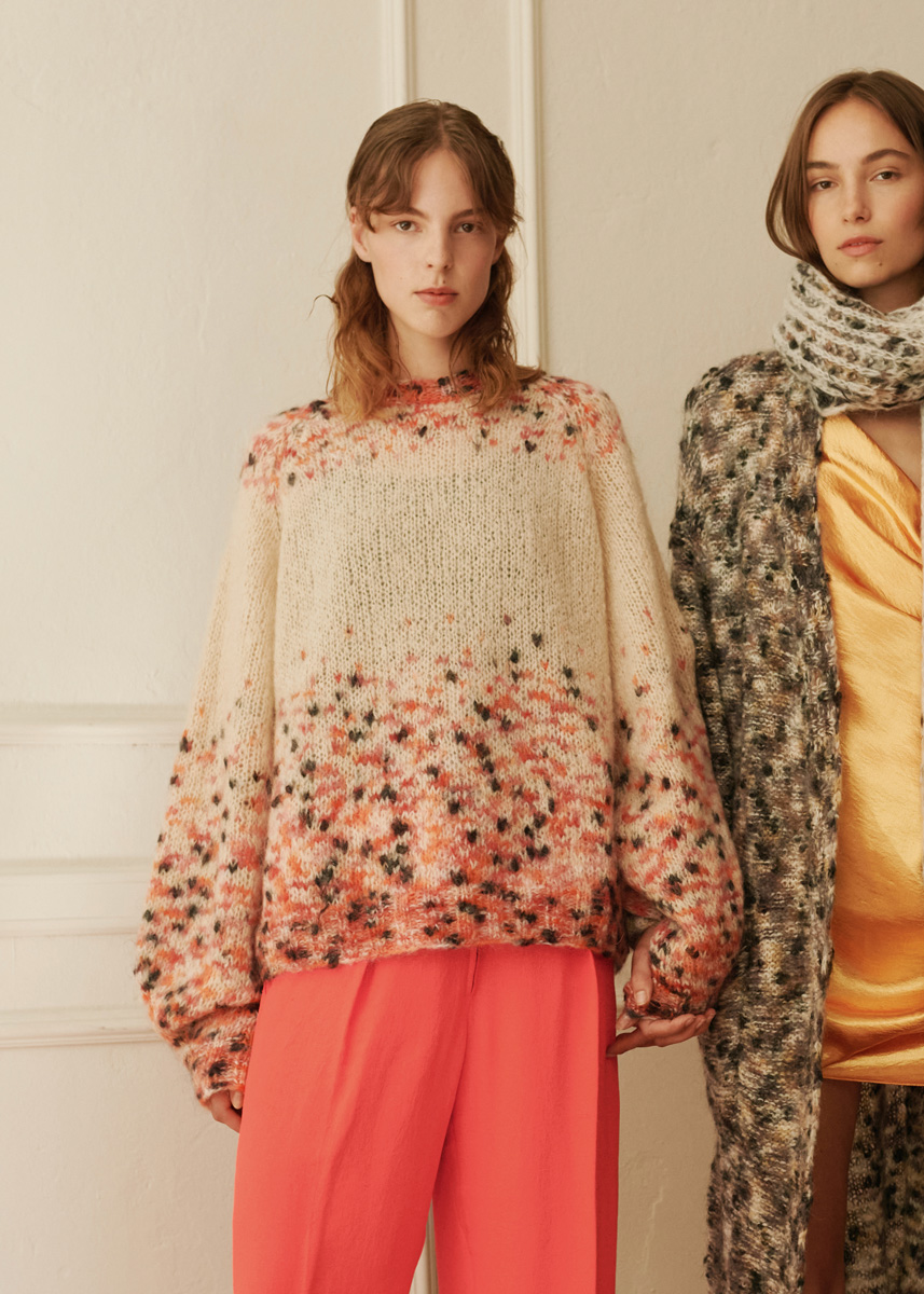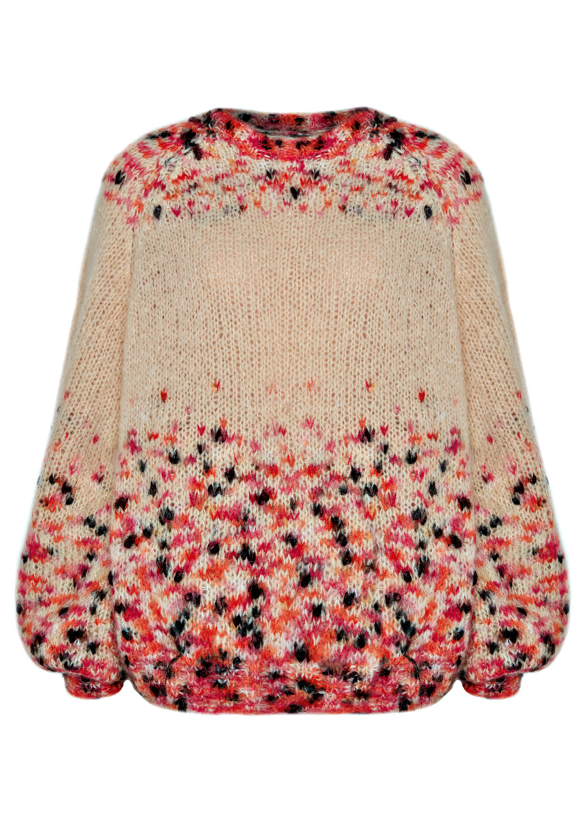 Lana Grossa-Qualität „Lala Berlin Brushy“ (42 % мохер (суперкид), 38 % шерсть (меринос), 20 % полиамид, длина нити 135 m/50 g): ок. 200 г розовый/оранжевый/ коралловый/красное вино/чёрно-коричневый (цв. 101) и ок. 250 г бежевый (цв. 7); сп. № 5 и 6, 1 кр. сп. № 5, 50 см длиной