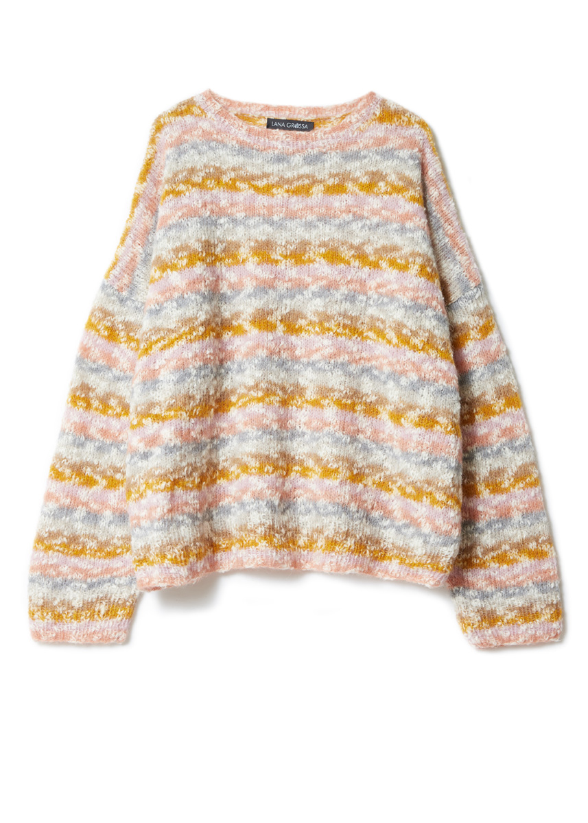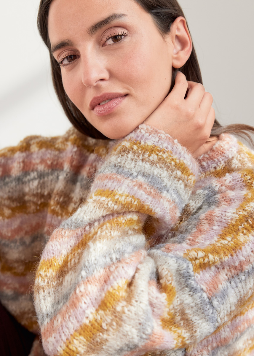100 (150–150) г желто- розовой/белой суровой (цв. 1), 50 (100– 100) г медово-желтой/белой суровой (цв. 8), 50 (100–100) г цвета верблюжьей шерсти/белой суровой (цв. 9), 50 (100–100) г розовой/белой суровой (цв. 2), 50 (100– 100) г серой/белой суровой (цв. 11) и 50 (50–100) г бежевой/белой суровой (цв. 10) пряжи Lala Berlin Buffy (47% альпака бэби, 30% хлопка, 23% полиамида, 225 м/ 50 г) фирмы Lana Grossa; прямые спицы № 4 и № 5, круговые спицы № 4 длиной 40 см.