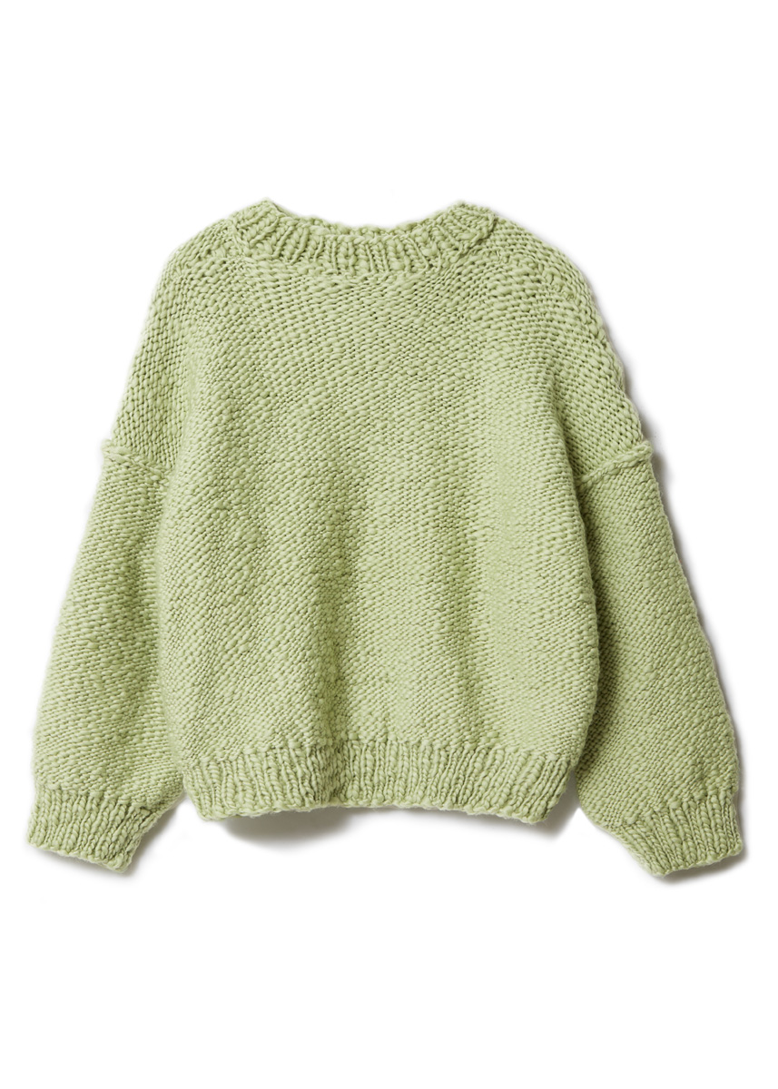 900 (1000–1100) г пастельно-зеленой (цв. 4) пряжи Lala Berlin Flamy (100% шерсти мерино, 70 м/100 г) фирмы Lana Grossa; круговые спицы № 5 и № 6, каждые длиной 40 и 80 см, крючок № 5