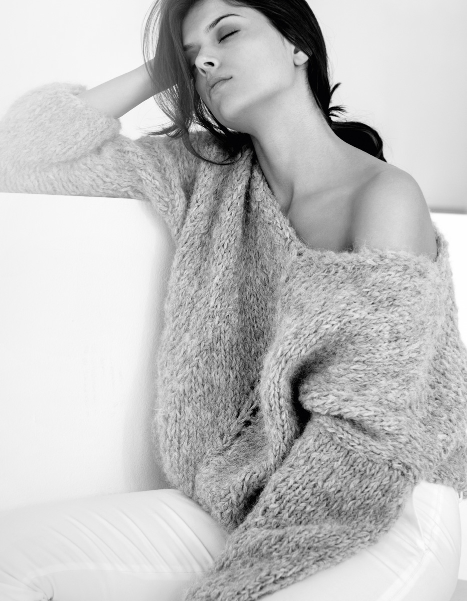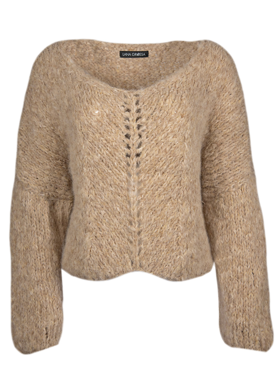 300 (350–400) г бежевой (цв. 2) пряжи Lala Berlin Furry (90% шерсти альпака, 10% полиамида, 75 м/50 г) фирмы Lana Grossa; прямые спицы № 10, крючок № 7