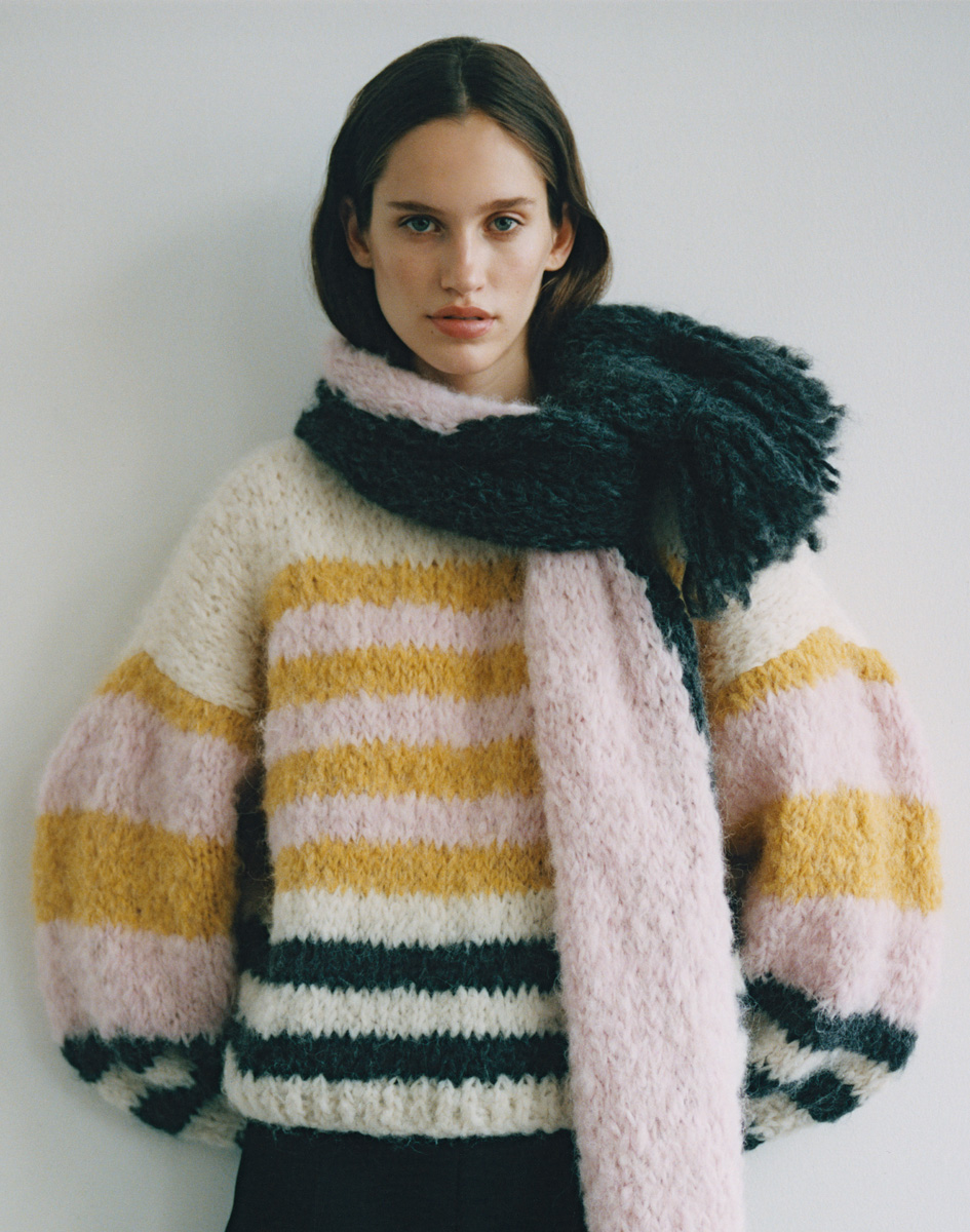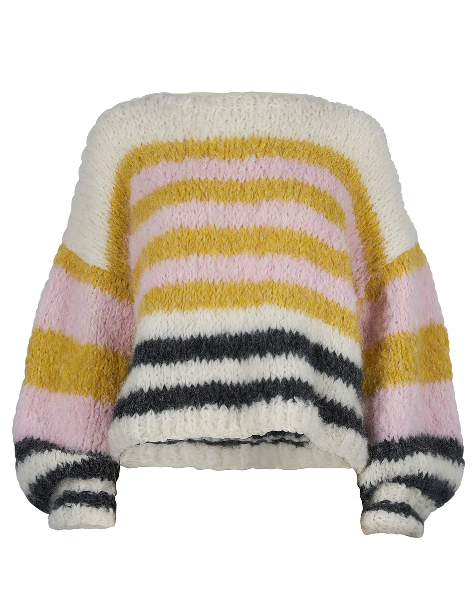 Lana Grossa-Qualität „Lala Berlin Furry“ (90 % альпака, 10 % полиамид, длина нитки m/50 g): ок. 150 (200) г чисто белый (цв. 1) и по ок. 100 г антрацит (цв. 10), пастельный розовый (цв. 12) и жёлтый (цв. 3); сп. № 8 и 12, 1 кр. сп. № 8, 50 см длиной