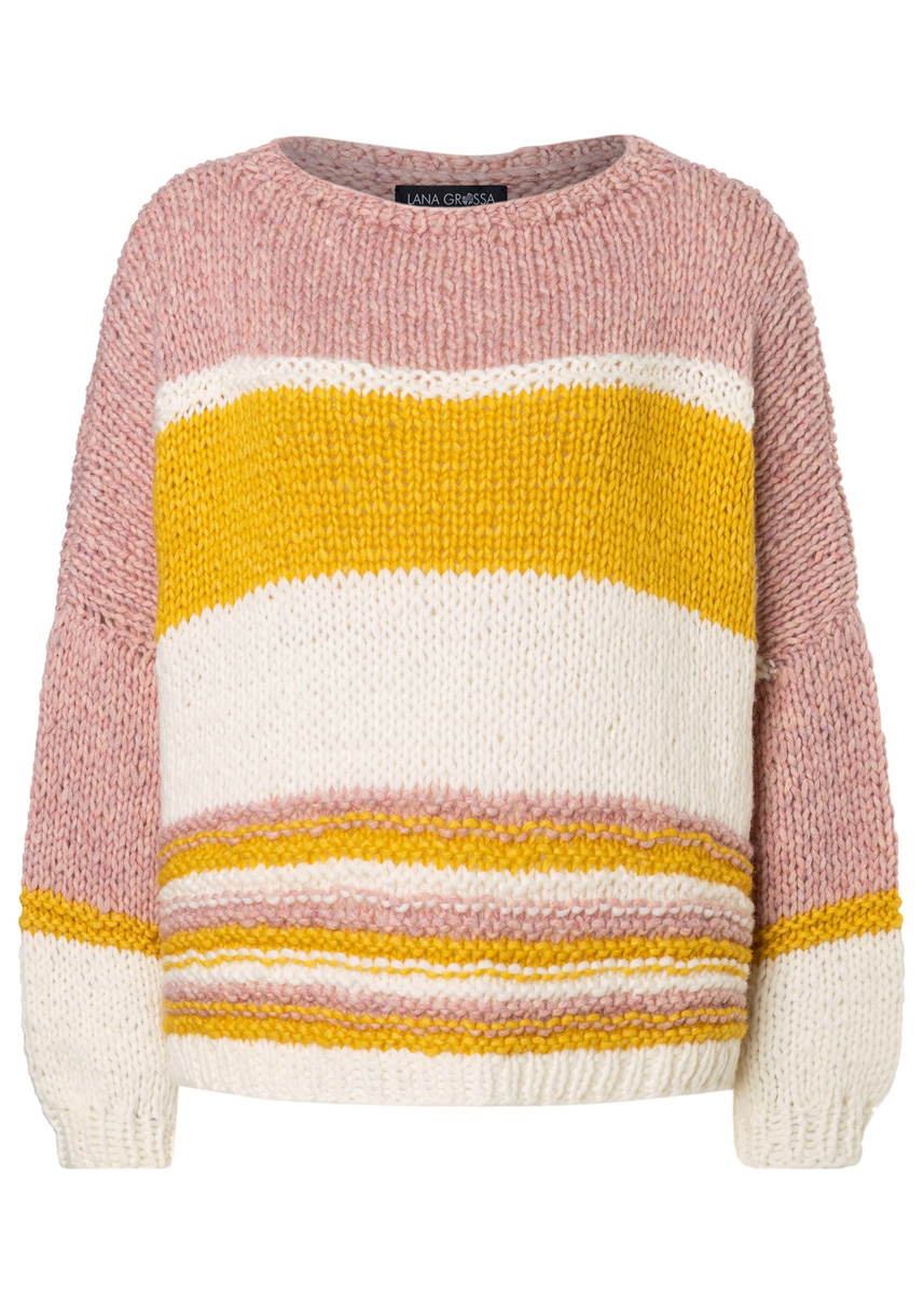 150 (200–250) г белой суровой (цв. 33), 150 (200–250) г розо- вой (цв. 6) и 100 (150–200) г желтой (цв. 15) пряжи Lala Berlin Lovely Cotton (75% шерсти мерино экстрафайн, 25% хлопка, 90 м/50 г) фирмы Lana Grossa; прямые спи- цы № 8 и № 9, круговые спицы № 8 длиной 40 см.