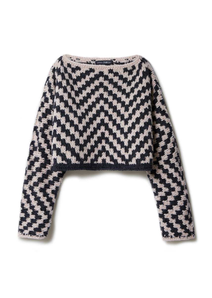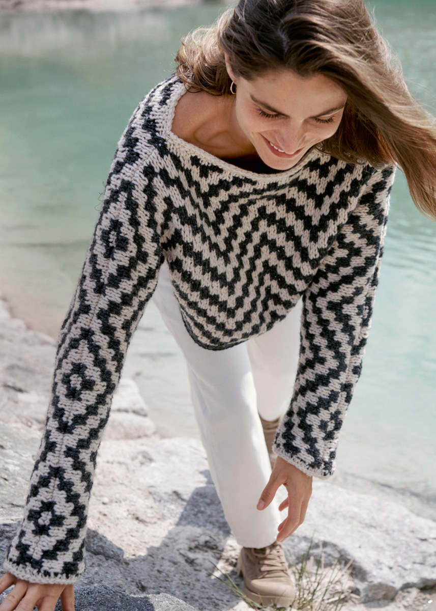 по 250 г бело-бежевой (цв. 7) и цвета антрацита (цв. 8) пряжи Lala Berlin Lovely Cotton (75% шерсти мерино суперфайн, 25% хлопка, 90 м/50 г) фирмы Lana Grossa; круговые спицы № 8 длиной 120 см, крючок № 7.