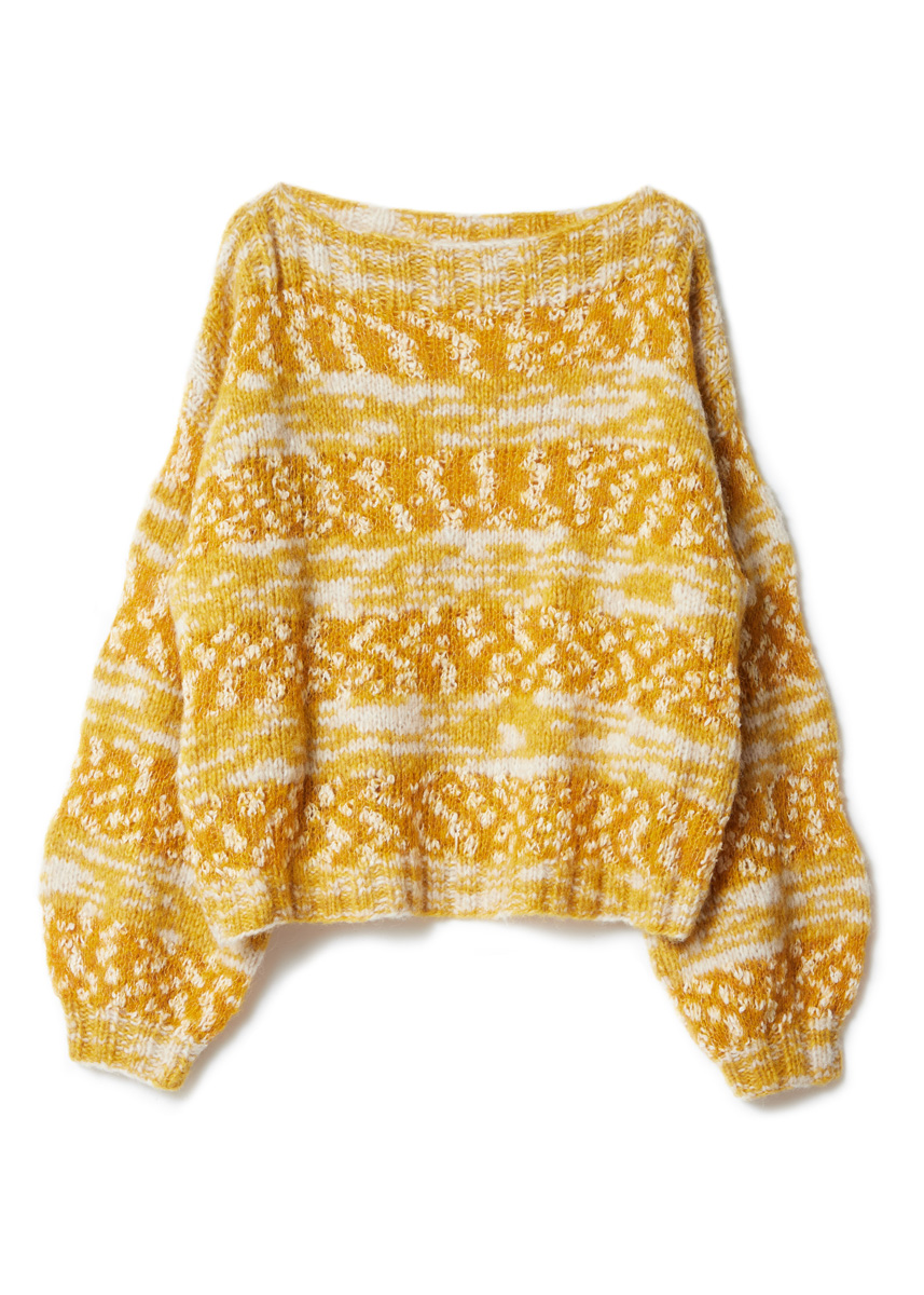 150 (200–200) г горчично-желтой/бело-бежевой (цв. 6) пряжи Lala Berlin Smoothy (62% альпака бэби, 27% полиамида, 11% шерсти мерино экстрафайн, 135 м/50 г) фирмы Lana Grossa и 100 (100–150) г медово-желтой/белой суровой (цв. 8) пряжи Lala Berlin Buffy (47% альпака бэби, 30% хлопка, 23% по- лиамида, 225 м/50 г) фирмы Lana Grossa; прямые спицы № 4,5 и № 6.
