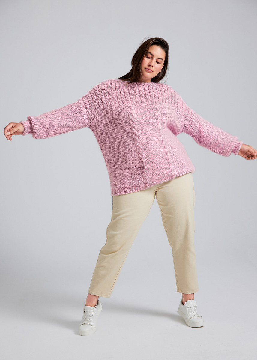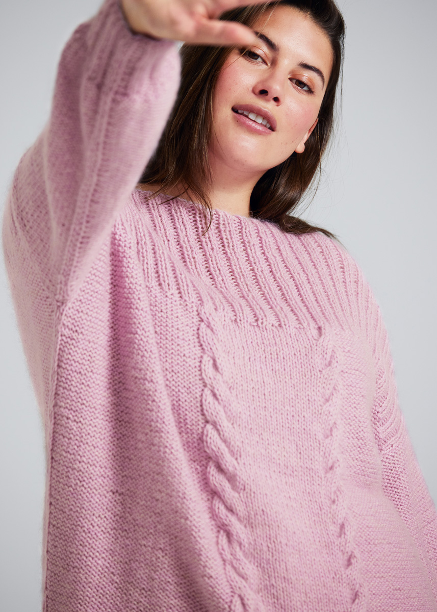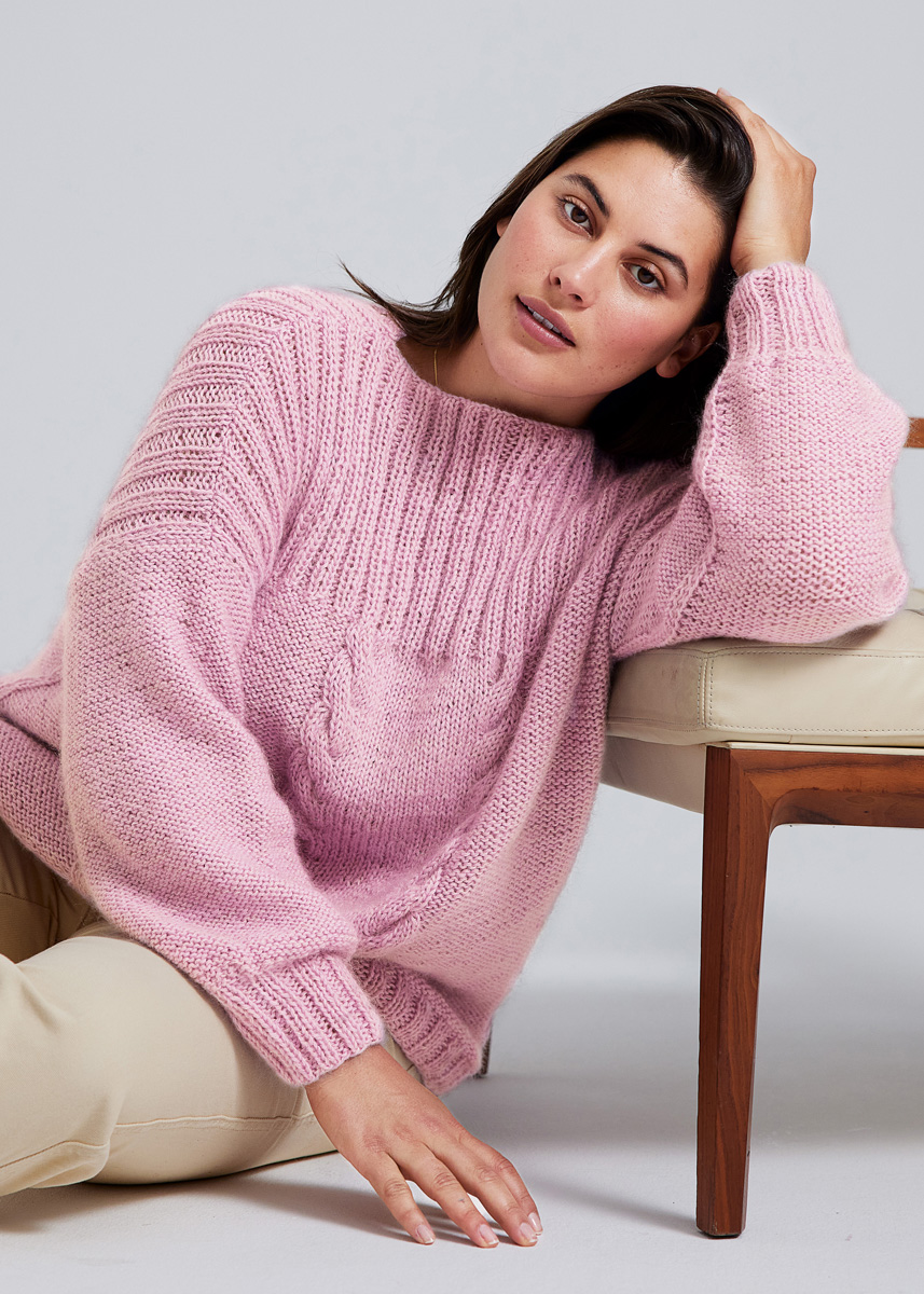 350 (400–450) г розовой (цв. 413) пряжи Landlust Alpaca Merino 160 (50% овечьей (мери- носовой) шерсти, 50% шерсти (ягненка) альпака, 160 м/ 50 г) и 125 (150–175) г пастельно-сиреневой (цв. 150) пряжи Silkhair (70% мохера, 30% шелка, 210 м/ 25 г) фирмы Lana Grossa; прямые спицы № 5 и № 5,5, 1 вспомогательная спица для кос.