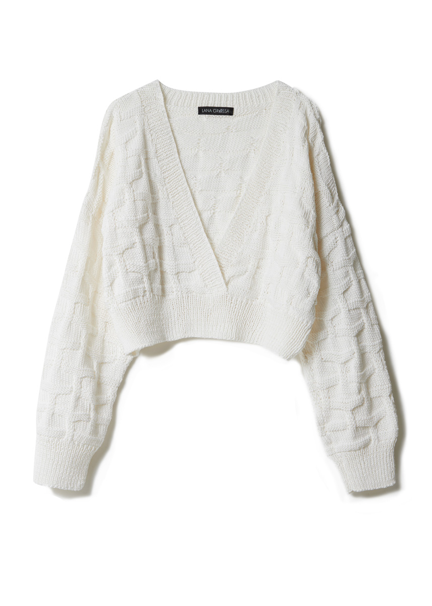 500 (550–600) г белой (цв. 4) пряжи Landlust Baumwolle (100% хлопка орга- нического (эко), 115 м/50 г) фирмы Lana Grossa; прямые спицы № 3 и № 4, круговые спицы № 3 длиной 80 см.