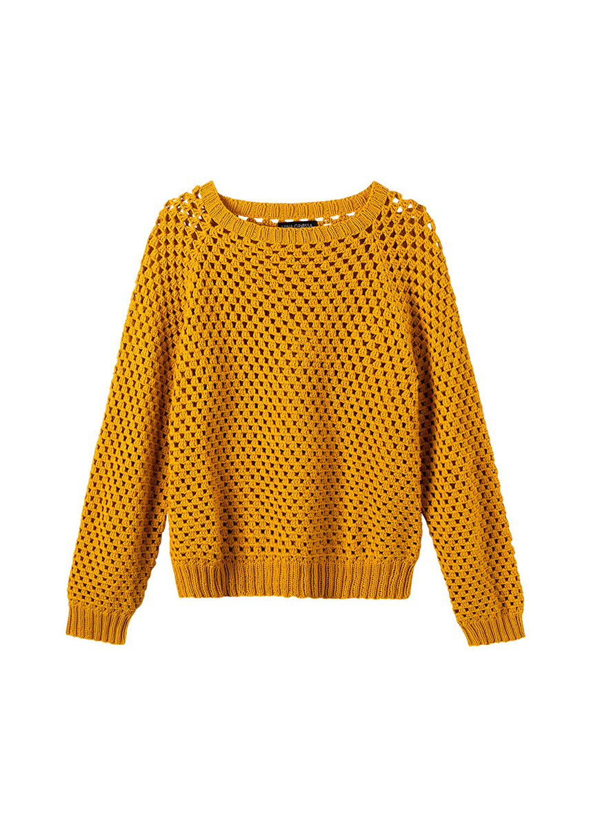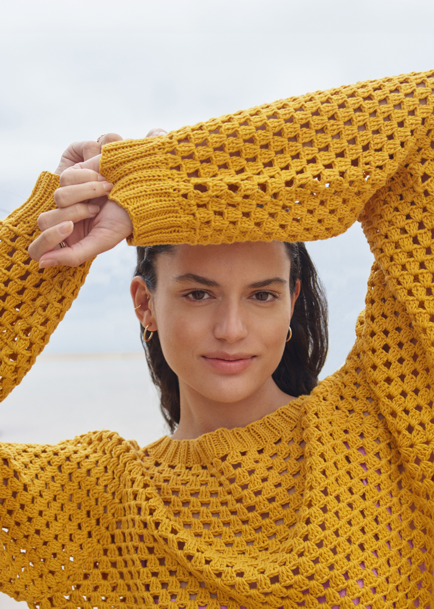 Lana Grossa-Qualität „Landlust Baumwolle” (100 % (био) хлопок, длина нити = ca. 115 m/50 g): ок. 650 г золотисто жёлтое (цв. 6); 1 крючок № 4, по 1 кр. сп. № 3,5, 50 и 80 см, чул. сп. № 3,5