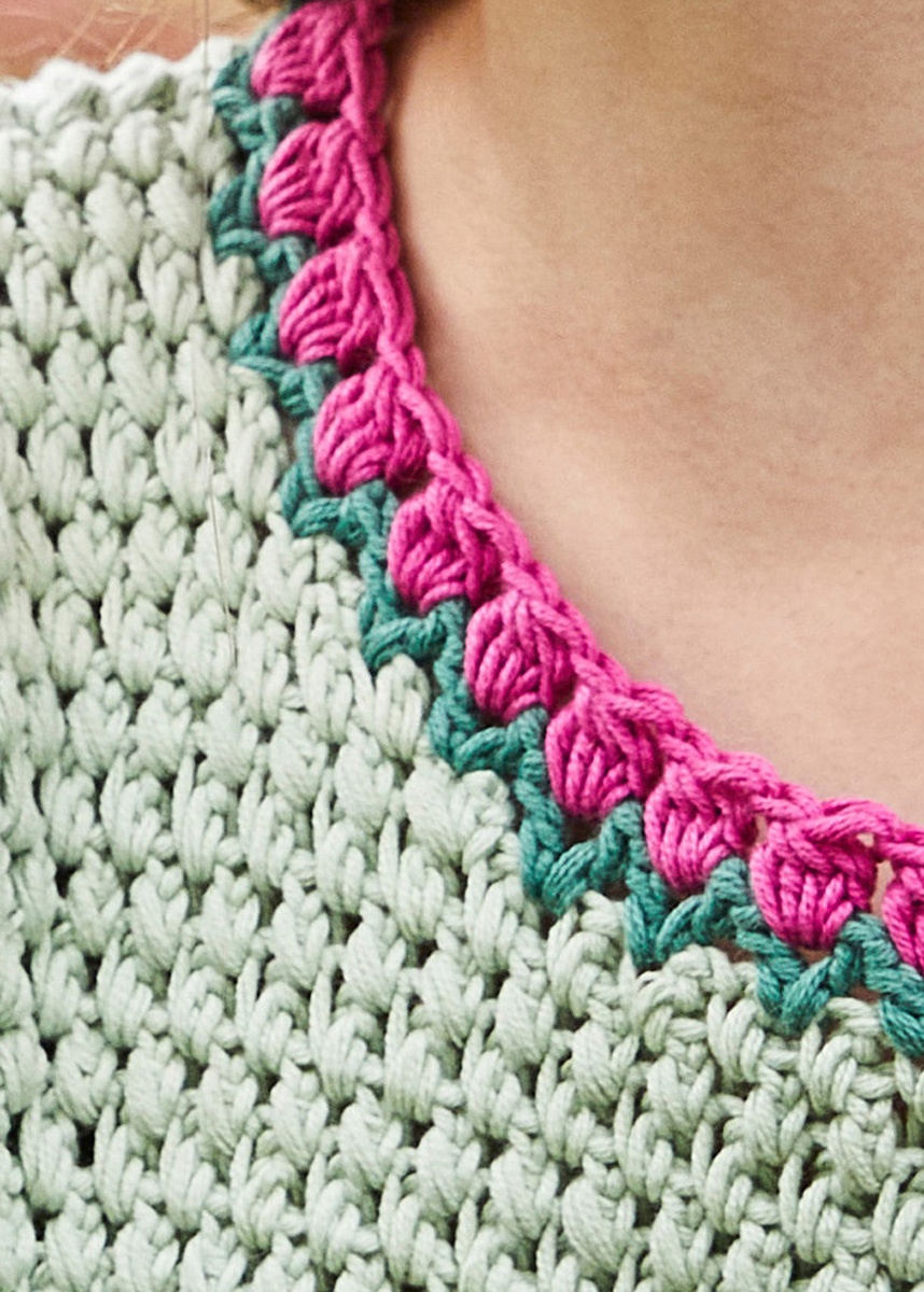 Lana Grossa-Qualität „Landlust-Baumwolle“ (100% хлопок (био), длина нити 115 m/50 g) 250 г (250 г - 300 г) пастельно-зелёный (цв 10) и по 50 г фуксия (цв 18) и зеленый изумруд (цв 9); 1 крючок № 3,5