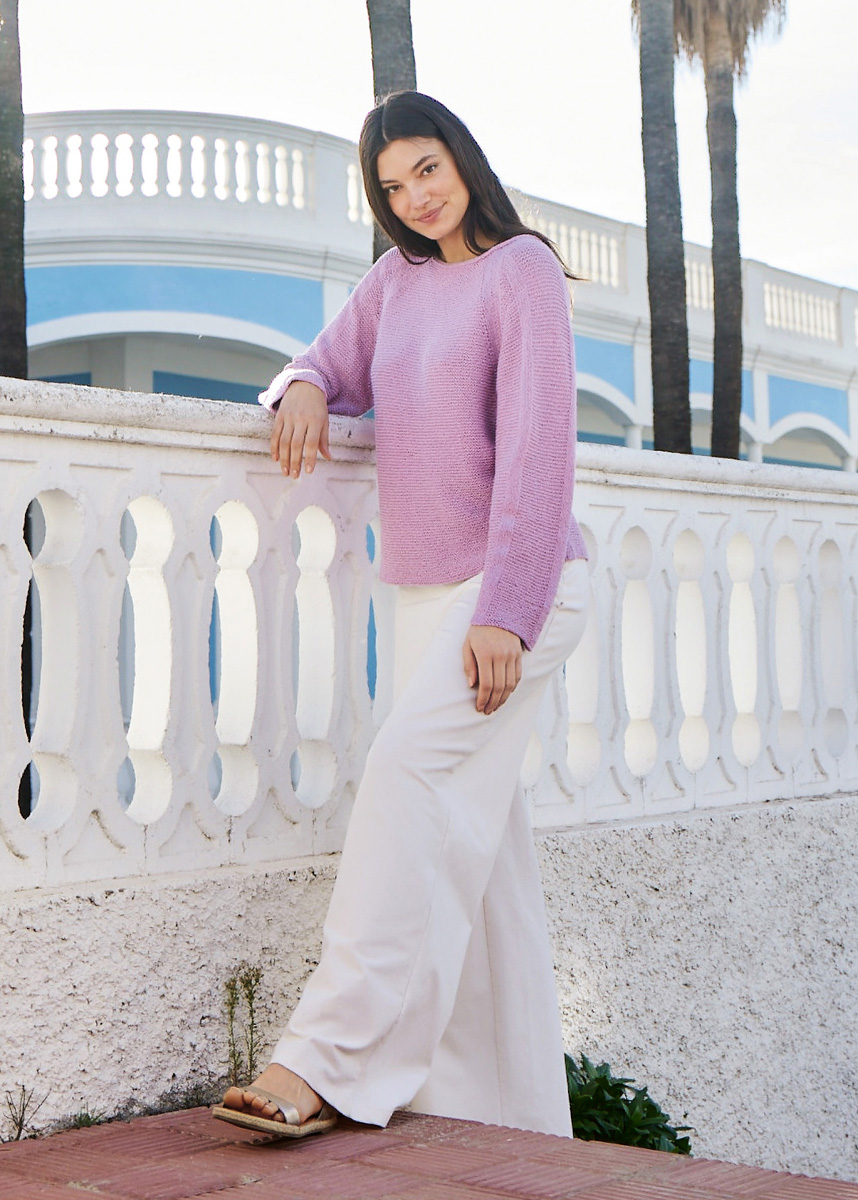 Lana Grossa-Qualität „Landlust Sommerseide“ (50% шёлк, 50% хлопок, длина нити 170 m/ 50 g), 450 (500– 550) г сирень (цв 22); сп. № 3 и 3,5, 1 кр. сп. № 3,5, длиной 40 см