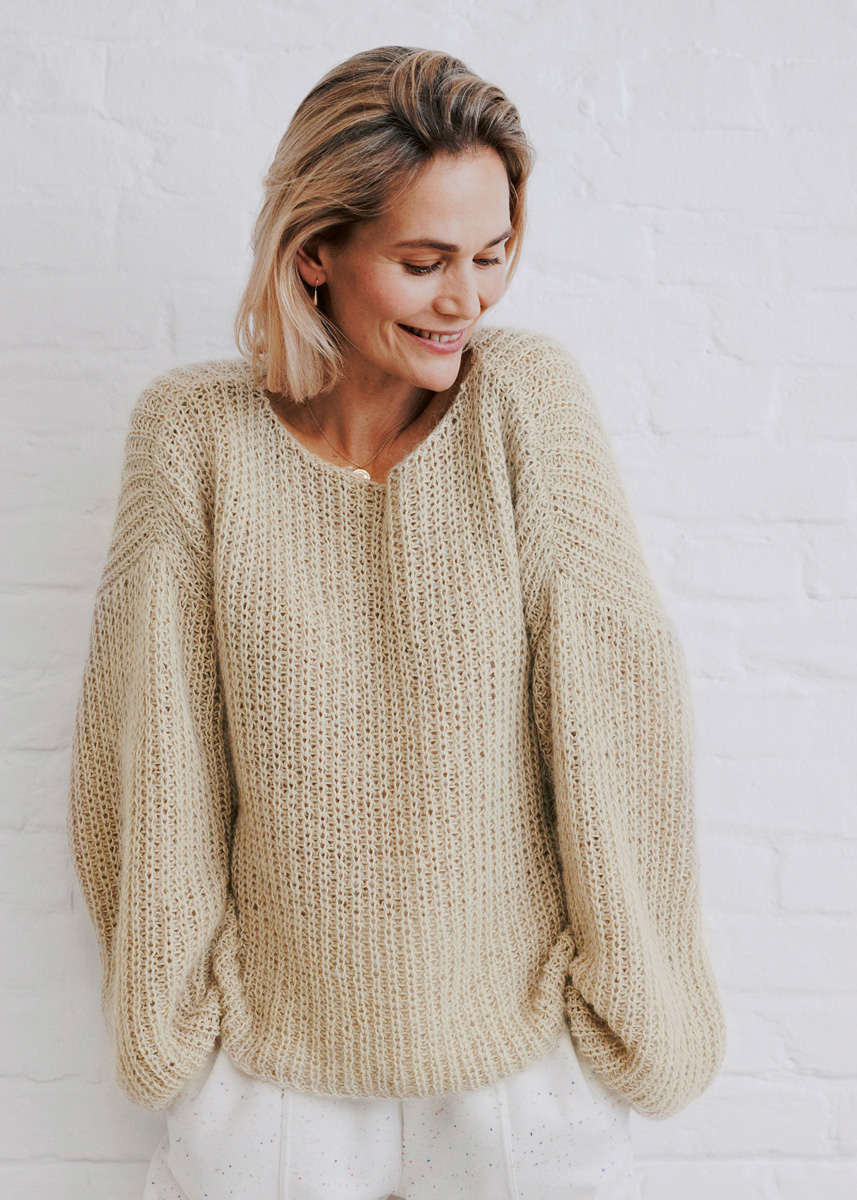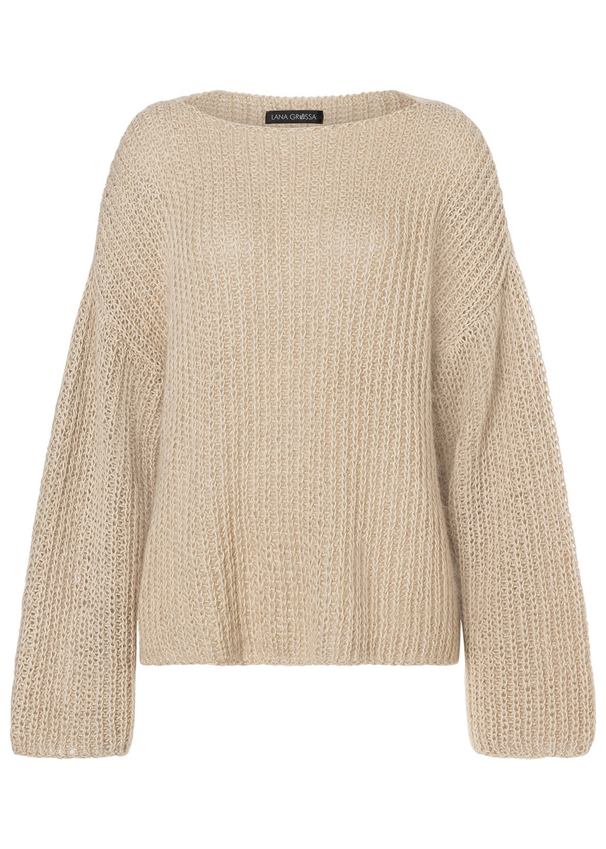 Lana Grossa Landlust Sommerseide (50% шёлк, 50% хлопок, длина нити 170 m/50 g), 400 (450 – 500) г натуральный (цв 2) и Lana Grossa Silkhair (70% мохер, 30% шёлк, длина нити 210 m/25 g), 150 (175 – 200) г светло бежевый (цв 18); сп. № 5,5 и 6.