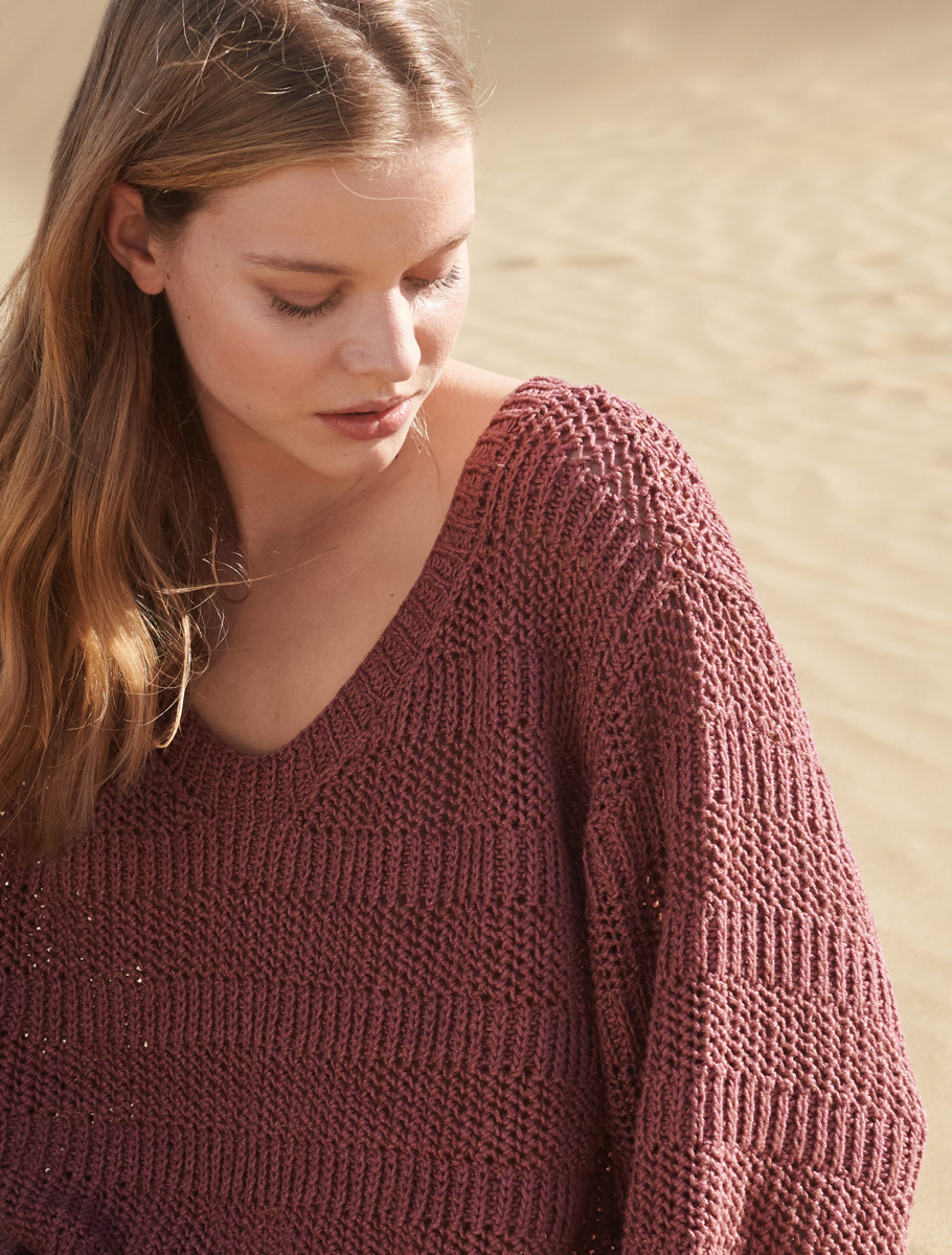 Lana Grossa-Qualität „Linarte” (40% вискоза, 30% хлопок, 20% лён, 10% полиамид, длина нити: 125 m / 50 g): 650 (700) г антично-красный (цв. 93); спицы № 4, кр. спицы № 4, длиной 60 см