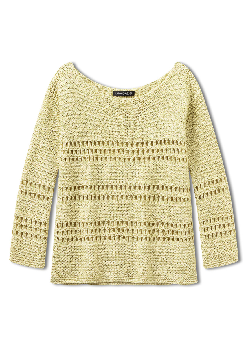500 (550–600) г цвета ванили (цв. 311) пряжи Linarte (40% вискозы, 30% хлопка, 20% льна, 10% полиамида, 125 м/50 г) фирмы Lana Grossa; прямые спицы № 3,5 и крючок № 3,5.