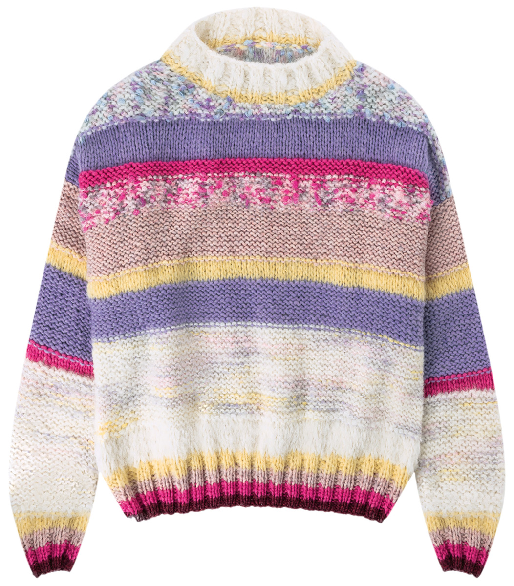 150 (200–200) г сиреневой (цв. 29), 100 (150–150) г розовой (цв. 6), 50 (100–100) г яр- ко-розовой (цв. 28) и 50 г цвета красного вина (цв. 25) пряжи Lala Berlin Lovely Cotton (75% шерсти мерино экс- трафайн, 25% хлопка, 90 м/50 г), 100 (150–150) г белой суровой (цв. 1) пряжи Lala Berlin Furry (90% альпака бэби, 10% полиамида, 75 м/50 г), 50 (100–100) г нежно-жел- той/оранжевой/желтой/светло-/темно-синей/сине-фи- олетовой (цв. 202) и 50 (100-100) г нежно-розо- вой/цвета гвоздики/ярко-розовой/серой (цв. 201) пряжи Lala Berlin Brushy II (40% мохера супер- кид, 36% шерсти мерино, 13% полиамида, 11% хлопка, 115 м/50 г), 100 г цвета ванили (цв. 19) пряжи Lala Berlin Brushy (42% мохера суперкид, 38% шерсти мерино, 20% полиамида, 135 м/50 г) и 100 (150–150) г белой суровой/сиреневой/ розовой (цв. 9) пряжи Lala Berlin Hazy (40% альпака бэби, 25% шерсти мерино экстрафайн, 25% полиамида, 6% лиоцелла, 4% хлопка, 250 м/ 50 г) фирмы Lana Grossa; прямые спицы № 6 и № 8, круговые спицы № 6 длиной 40 см.