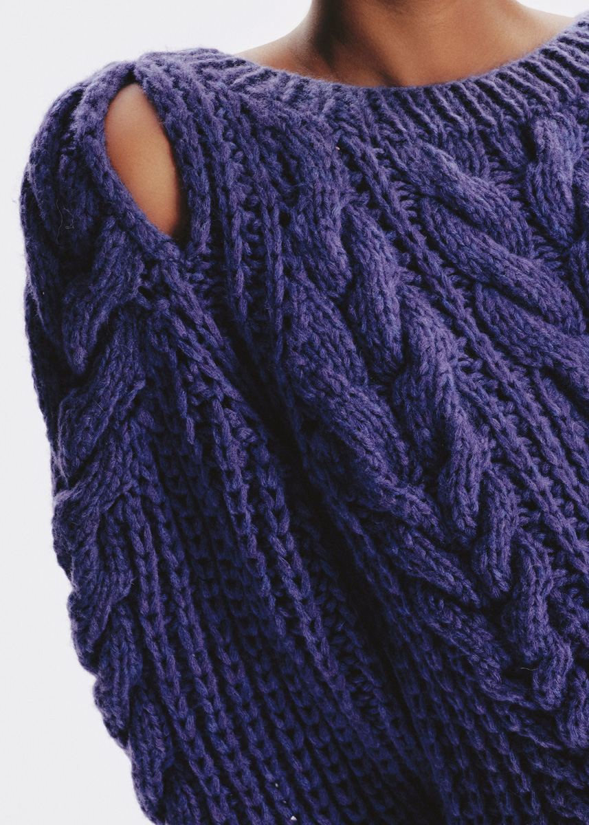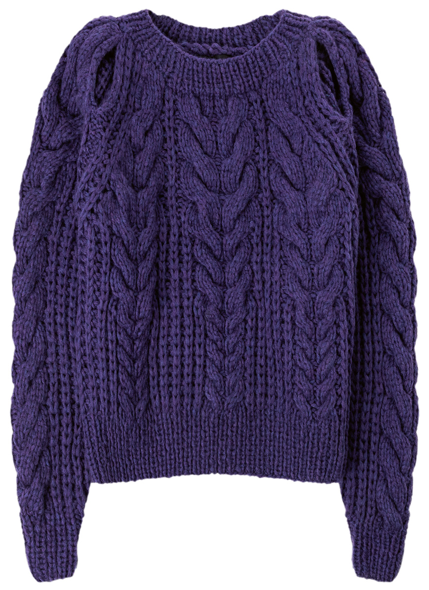 500 (550–600) г темно-фиолетовой (цв. 30) пряжи Lala Berlin Lovely Cotton (75% шерсти мерино экстрафайн, 25% хлопка, 90 м/50 г) фирмы Lana Grossa; прямые спицы № 9, круговые спицы № 9 длиной 40 см и 1 вспомогательная спица для кос
