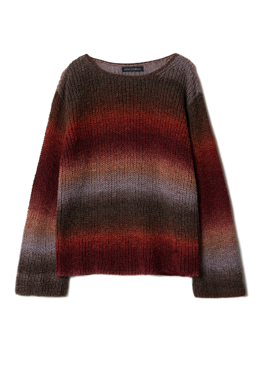 Lana Grossa-Qualität „Mare” (50 % лён, 33 % шёлк, 17 % хлопок, длина нити = ок. 330 m/100 g): ок. 500 (500–600) г серо-коричневый/серо-фиолетовый/персик/ цвет ржавчины/бургунд (цв. 14); сп. № 3,5, 1 кр. сп. № 3, 50 см.