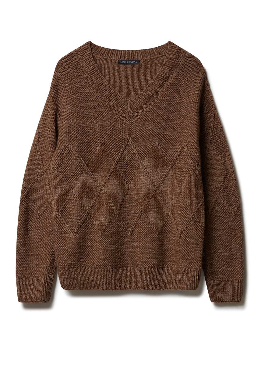 350 (400–450) г цвета нуги (цв. 39) пряжи Merino Superiore (100% шерсти мерино экстра- файн, 180 м/50 г) и 300 (350–400) г темно-коричне- вой (цв. 17) пряжи Ecopuno (72% хлопка, 17% шерсти мерино, 11% альпака бэби, 215 м/50 г) фирмы Lana Grossa; прямые спицы № 5 и № 7, а также круговые спицы № 5 длиной 40 см и 1 вспомогательная спица для кос.