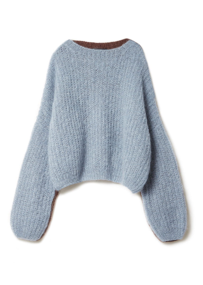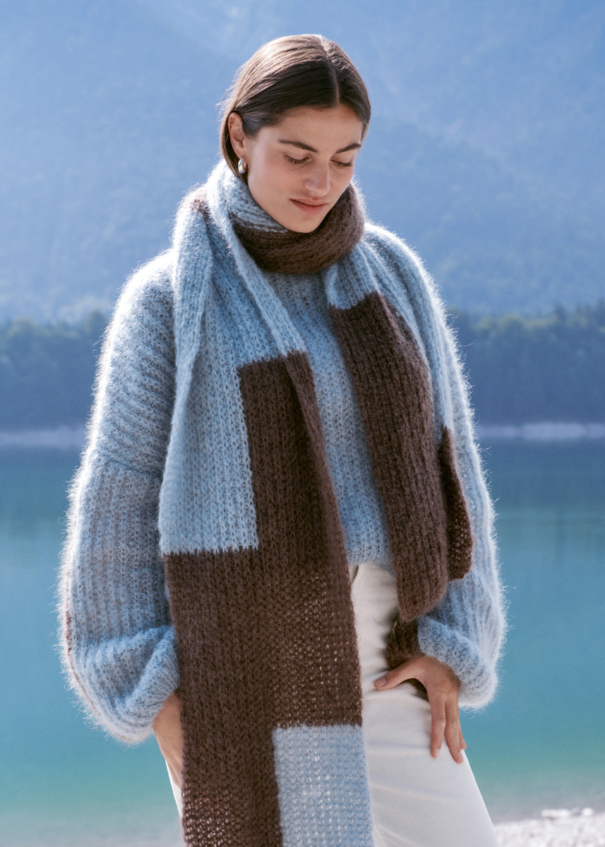 150 (200–200) г серосиней (цв. 4) и 150 (200–200) г темно-коричневой (цв. 12) пряжи Mohair Moda (70% мохера суперкид, 20% шерсти мерино суперфайн, 10% полиамида, 140 м/50 г) фирмы Lana Grossa; прямые спицы № 4 и № 6