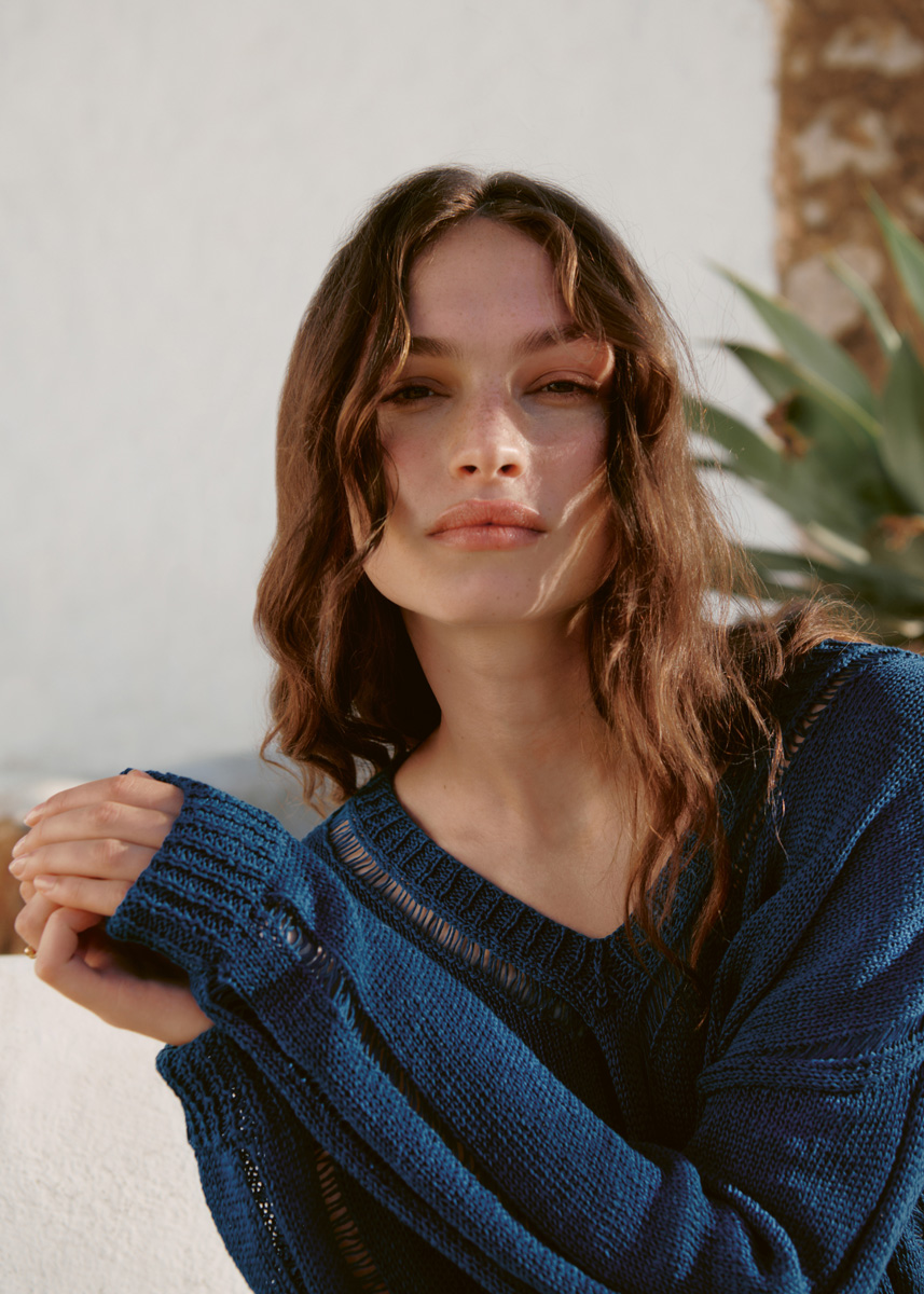 Lana Grossa-Qualität „Nastrino” (100 % хлопок, длина нити = ок. 190 m/50 g): ок. 350 (400) г тёмно-синий (цв. 16); сп. № 2,5 и 3,5, 1 кр. сп. № 2,5, 60 см