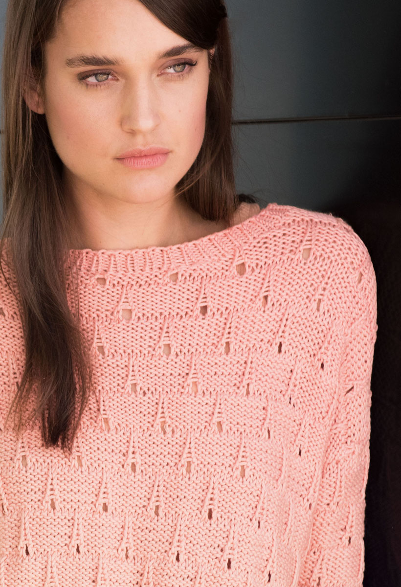 550 (600 – 650) г лососевой (цвет 85) пряжи Organico фирмы Lana Grossa (100 % хлопка, 90 м/50 г); прямые спицы № 4,5 и 5, круговые спицы № 4,5 длиной 40 см
