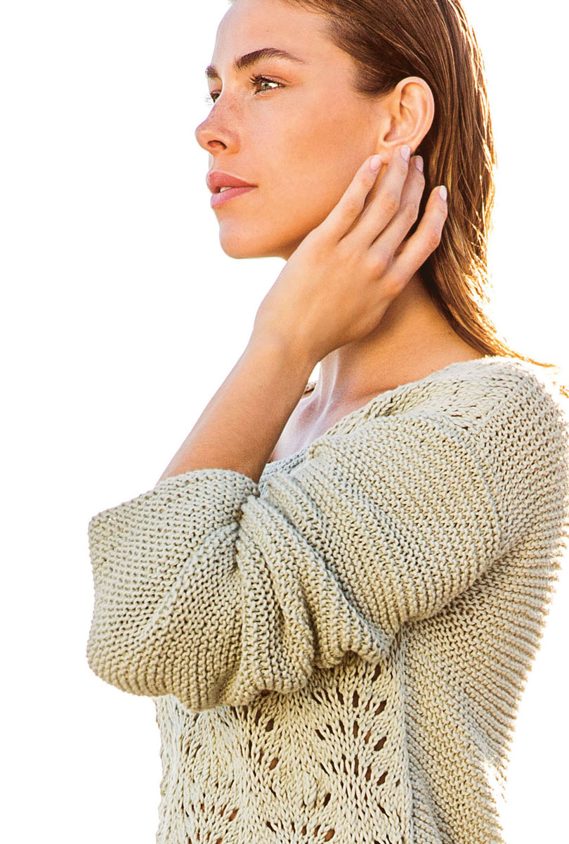 500 (550) г камышового зеленого цвета (цвет 89) пряжи Organico фирмы Lana Grossa (100 % биологически чистого хлопка, 90 м/50 г); прямые спицы № 4, круговые спицы № 4 длиной 60 см