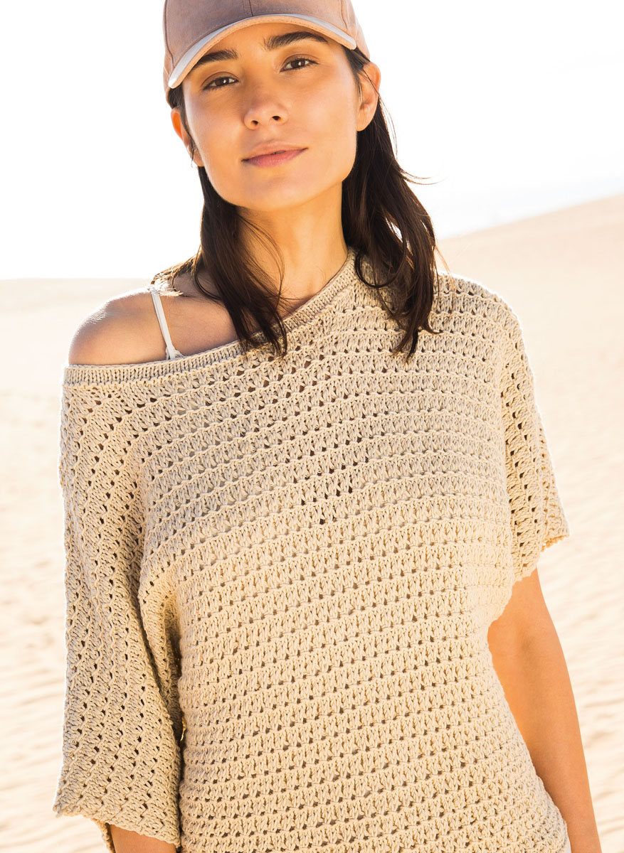 450 (500 – 550) г бежевой (цвет 100) пряжи Organico фирмы Lana Grossa (100 % биологически чистого хлопка, 90 м/50 г); прямые спицы № 5 и 5,5, круговые спицы № 5,5 длиной 80 см, круговые спицы № 4,5 длиной 50 см