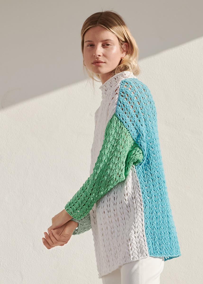 200 (250–250) г бирюзовой (цв. 115), 200 (250–250) г белой (цв. 7), 100 (150–150) г светло-зеленой (цв. 128) и 100 (150–150) г нежно-зеленой (цв. 72) пряжи Organico (100% био-хлопка, 90 м/50 г) фирмы Lana Grossa; прямые спицы № 6,5, круговые спицы № 5,5 длиной 40 см, крючок № 5