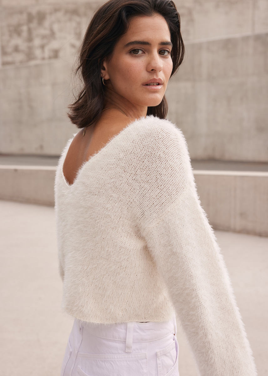 250 (300–350) г цвета экрю (цв. 8) пряжи Per Fortuna (74% хлоп- ка органического (эко), 26% полиамида, 190 м/50 г) фирмы Lana Grossa; прямые спицы № 4,5 и круговые спицы № 4,5 дли- ной 40 см.