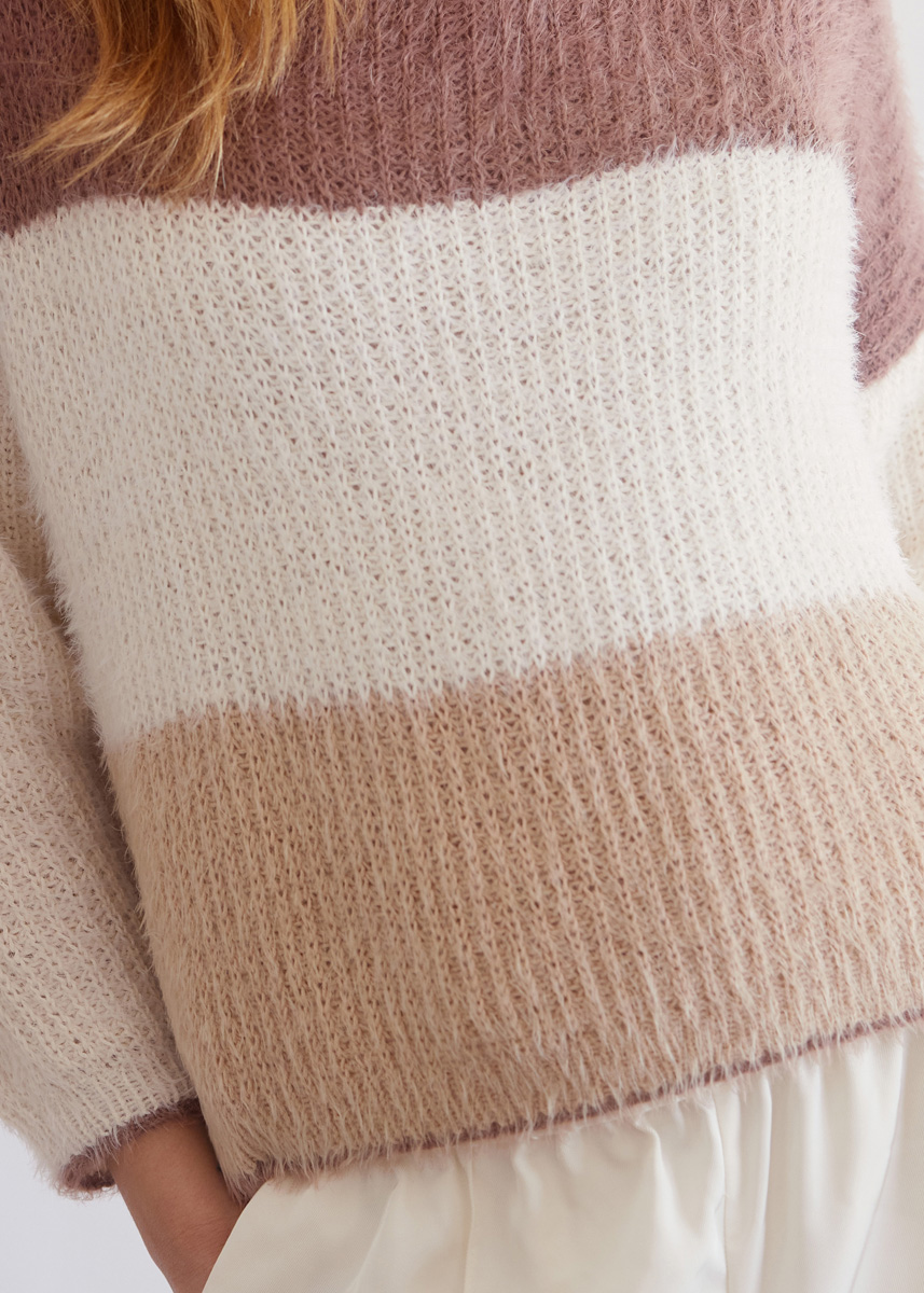 200 (250–300) г цвета экрю (цв. 8) и по 100 (150–150) г цвета нуги (цв. 29) и бежевой (цв. 30) пряжи Per Fortuna (74% хлопка органического (эко), 26% полиамида, 190 м/50 г) фирмы Lana Grossa; прямые спицы № 3,5 и № 4,5, кру- говые спицы № 3,5 длиной 50 см.