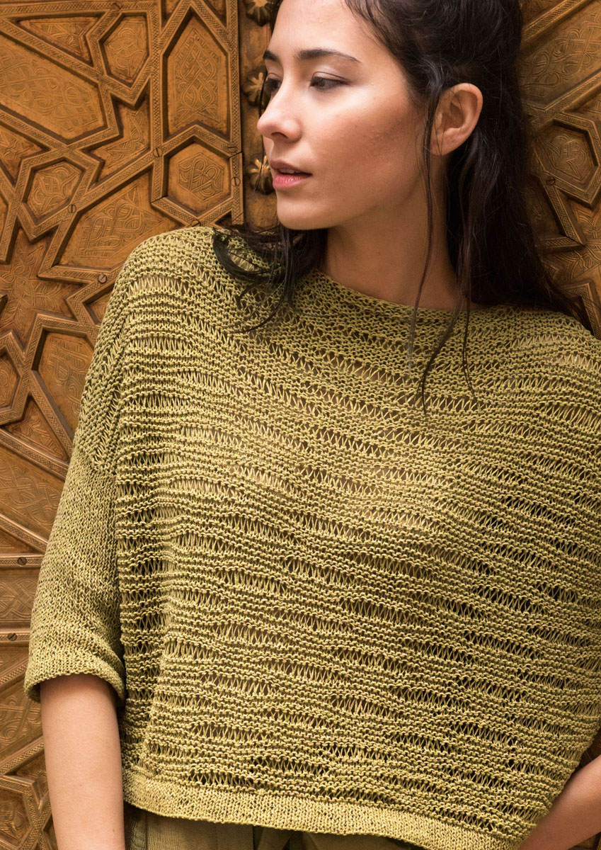 400 (450) г цвета верблюжьей шерсти/желто-зеленой/золотистой (цв. 14) пряжи Nizza (74% хлопка, 25% полиэстера, 1% металлизированного полиэстера, 115 м/50 г) фирмы Lana Grossa; прямые спицы № 3,5 и № 4,5, круговые спицы № 4,5 длиной 60 см
