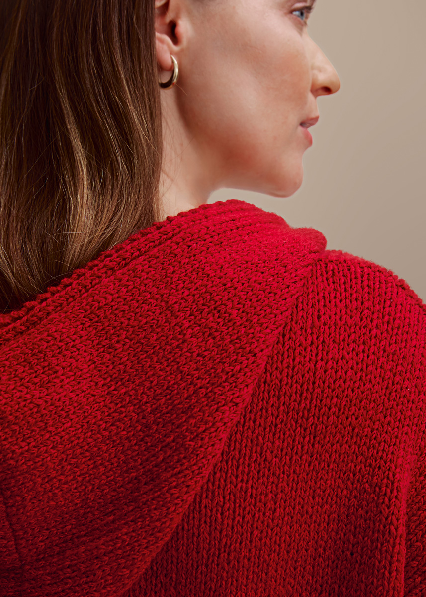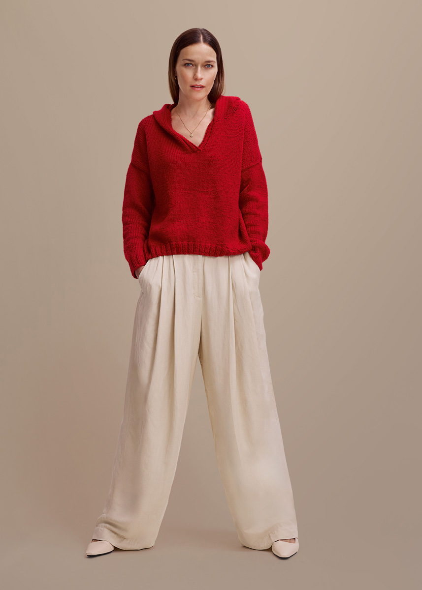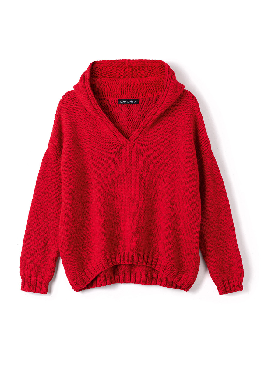Lana Grossa-Qualität „Cool Merino“ (90 % шерсть (меринос), 10 % полиамид, длина нити = ок.150 m/50 g): ок 450 (500–550–600–650) г красный (цв 34); сп. № 5 и 5,5; 1 кр. сп. № 5.