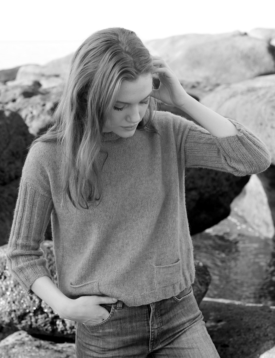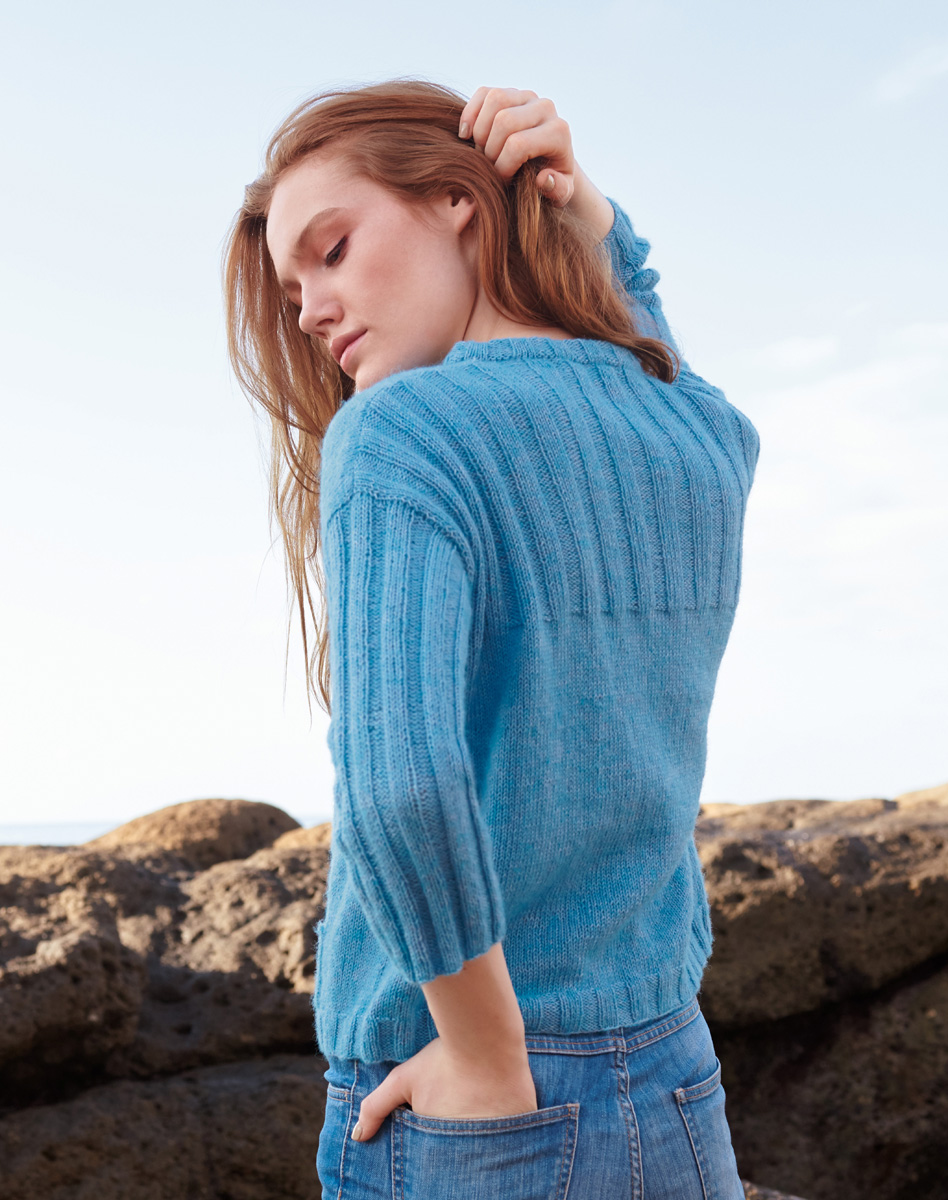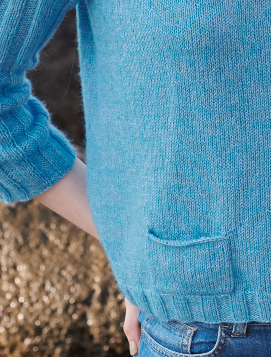 Lana Grossa-Qualität „Ecopuno” (72% хлопок, 17% меринос, 11% альпака, длина нити: 215 m / 50 g): 300 (350) г сине-бирюзовый (цв. 29); спицы № 3 и 4, 1 кр. спицы № 3, длиной 40 см