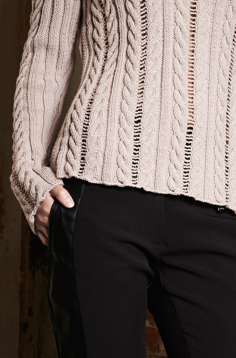 Звезды вязания — узоры. В данном случае, еще и в достойном обрамлении правильного женственного силуэта. Сочетание кос и ажурных структур, длинных рукавов и привлекательного V-образного выреза создают ощущение легкости, несмотря на фактурный рисунок.
