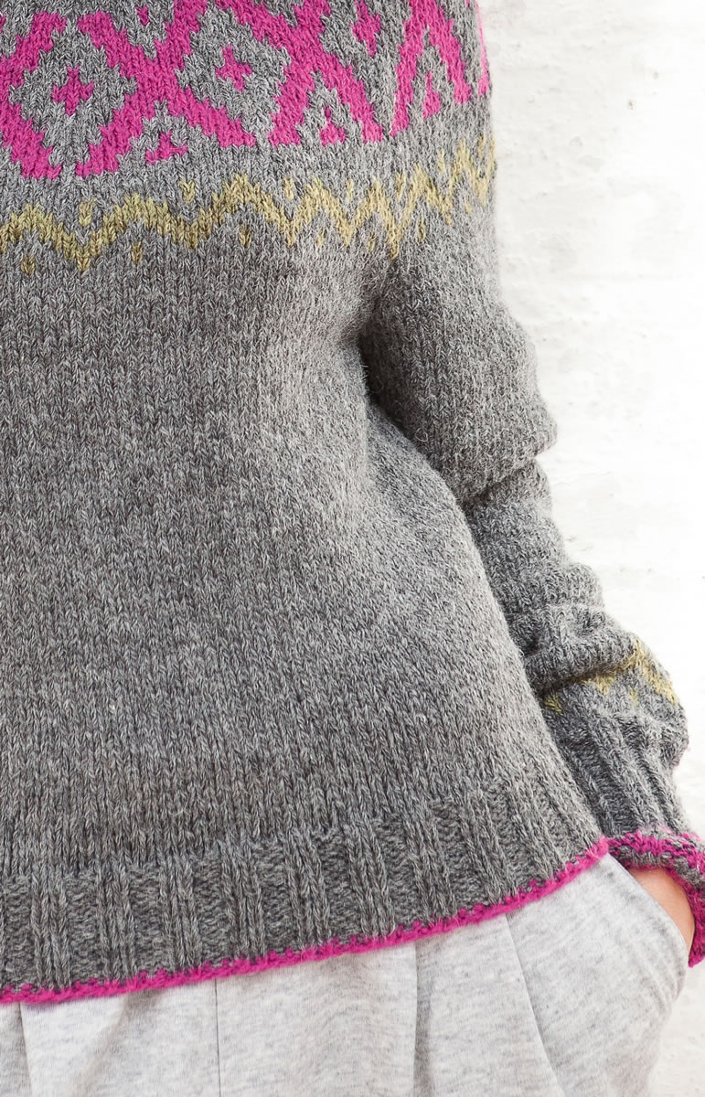 Самый популярный норвежский пуловер! Игра на контрасте классического серого цвета и яркого орнамента. Тонкий высокий воротник подчеркнет Вашу женственность и привлечет внимание к лицу.